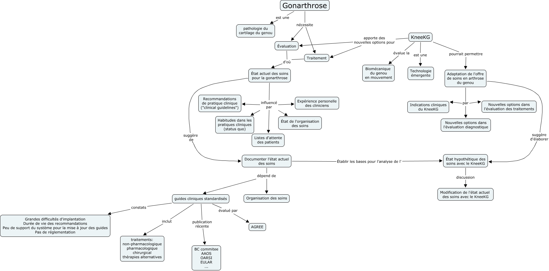 Cette carte conceptuelle, cree avec IHMC CmapTools, contient des informations liees a : KneeKG_v3a_encours, État actuel des soins pour la gonarthrose influencé par Habitudes dans les pratiques cliniques (status quo), Documenter l'état actuel des soins dépend de guides cliniques standardisés, Traitement d'où État actuel des soins pour la gonarthrose, État actuel des soins pour la gonarthrose influencé par Listes d'attente des patients, Gonarthrose nécessite Évaluation, État actuel des soins pour la gonarthrose influencé par État de l'organisation des soins, KneeKG pourrait permettre Adaptation de l'offre de soins en arthrose du genou, guides cliniques standardisés publication récente BC commitee AAOS OARSI EULAR ..., État hypothétique des soins avec le KneeKG discussion Modification de l'état actuel des soins avec le KneeKG, KneeKG évalue la Biomécanique du genou en mouvement, Adaptation de l'offre de soins en arthrose du genou par Indications cliniques du KneeKG, Adaptation de l'offre de soins en arthrose du genou par Nouvelles options dans l'évaluation diagnostique, Adaptation de l'offre de soins en arthrose du genou suggère d'élaborer État hypothétique des soins avec le KneeKG, Gonarthrose est une pathologie du cartilage du genou, guides cliniques standardisés constats Grandes difficultés d'implantation Durée de vie des recommandations Peu de support du système pour la mise à jour des guides Pas de réglementation, Gonarthrose nécessite Traitement, Évaluation d'où État actuel des soins pour la gonarthrose, KneeKG apporte des nouvelles options pour Évaluation, guides cliniques standardisés inclut traitements: non-pharmacologique pharmacologique chirurgical thérapies alternatives, guides cliniques standardisés évalué par AGREE