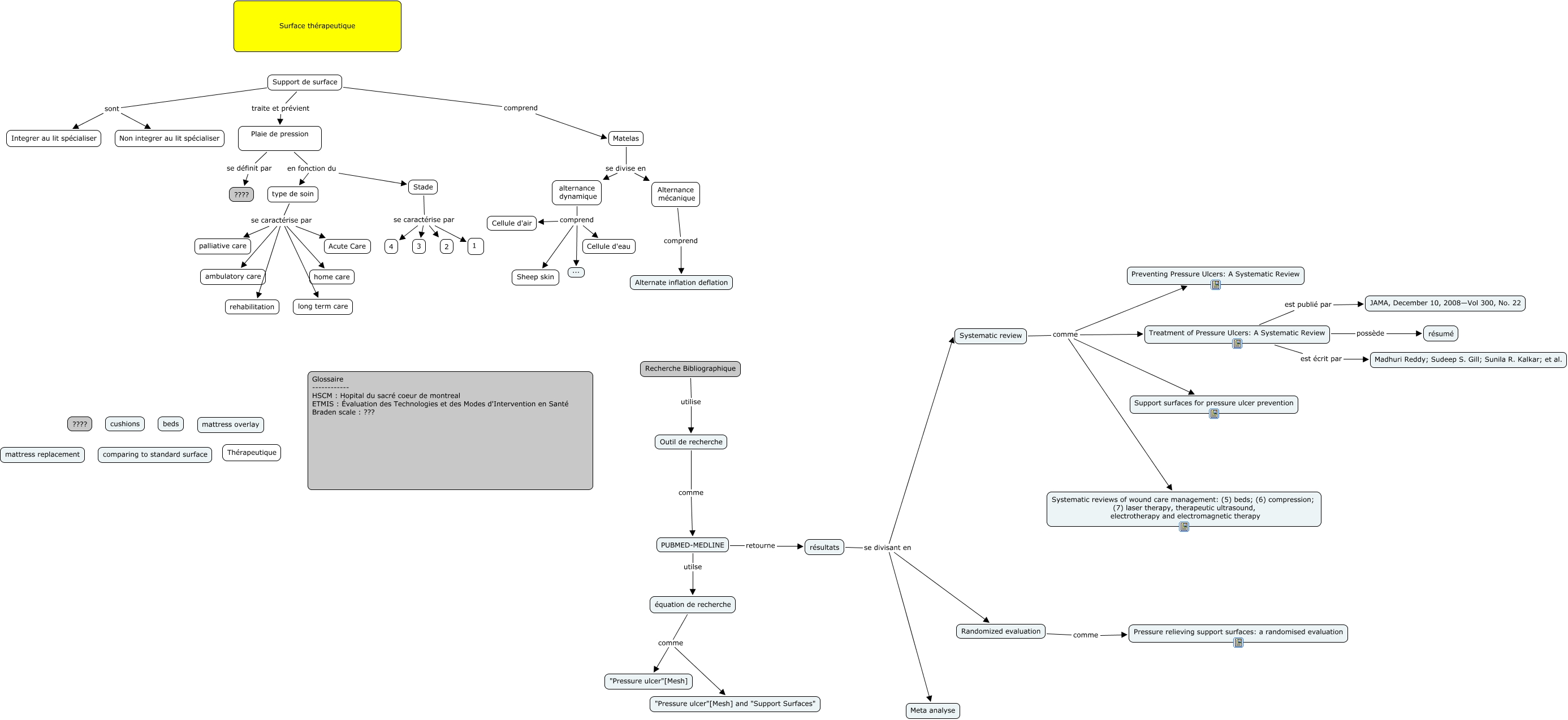 This Concept Map, created with IHMC CmapTools, has information related to: support_therapeutique_Thuot_Fournier, Outil de recherche comme PUBMED-MEDLINE, type de soin se caractérise par ambulatory care, Stade se caractérise par 4, Treatment of Pressure Ulcers: A Systematic Review est écrit par Madhuri Reddy; Sudeep S. Gill; Sunila R. Kalkar; et al., Plaie de pression en fonction du Stade, Systematic review comme Preventing Pressure Ulcers: A Systematic Review, Systematic review comme Treatment of Pressure Ulcers: A Systematic Review, Alternance mécanique comprend Alternate inflation deflation, équation de recherche comme "Pressure ulcer"[Mesh], PUBMED-MEDLINE utilse équation de recherche, Support de surface sont Non integrer au lit spécialiser, Randomized evaluation comme Pressure relieving support surfaces: a randomised evaluation, Recherche Bibliographique utilise Outil de recherche, type de soin se caractérise par palliative care, résultats se divisant en Systematic review, type de soin se caractérise par long term care, Stade se caractérise par 1, Systematic review comme Support surfaces for pressure ulcer prevention, Systematic review comme Systematic reviews of wound care management: (5) beds; (6) compression; (7) laser therapy, therapeutic ultrasound, electrotherapy and electromagnetic therapy, Support de surface comprend Matelas