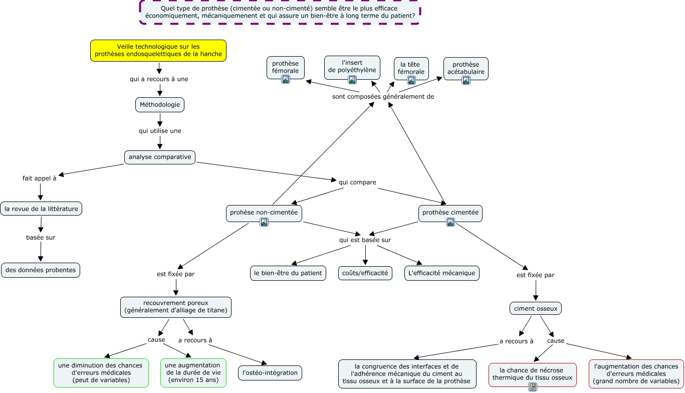 Cette carte conceptuelle, cree avec IHMC CmapTools, contient des informations liees a : Prothèse de hanche endosquelettique, prohèse non-cimentée sont composées généralement de prothèse acétabulaire, prohèse non-cimentée sont composées généralement de l'insert de polyéthylène, analyse comparative fait appel à la revue de la littérature, prothèse cimentée qui est basée sur coûts/efficacité, la revue de la littérature basée sur des données probentes, ciment osseux a recours à la congruence des interfaces et de l'adhérence mécanique du ciment au tissu osseux et à la surface de la prothèse, analyse comparative qui compare prohèse non-cimentée, ciment osseux cause la chance de nécrose thermique du tissu osseux, prohèse non-cimentée qui est basée sur coûts/efficacité, prohèse non-cimentée est fixée par recouvrement poreux (généralement d'alliage de titane), prothèse cimentée sont composées généralement de l'insert de polyéthylène, Veille technologique sur les prothèses endosquelettiques de la hanche qui a recours à une Méthodologie, ciment osseux cause l'augmentation des chances d'erreurs médicales (grand nombre de variables), prohèse non-cimentée sont composées généralement de la tête fémorale, recouvrement poreux (généralement d'alliage de titane) cause une diminution des chances d'erreurs médicales (peut de variables), prothèse cimentée sont composées généralement de prothèse acétabulaire, prothèse cimentée sont composées généralement de prothèse fémorale, prohèse non-cimentée sont composées généralement de prothèse fémorale, recouvrement poreux (généralement d'alliage de titane) a recours à l'ostéo-intégration, Méthodologie qui utilise une analyse comparative