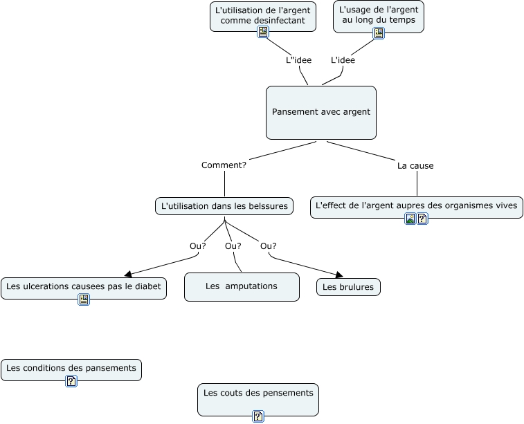 Cette carte conceptuelle, cree avec IHMC CmapTools, contient des informations liees a : Pensement argent, L'utilisation dans les belssures Ou? Les ulcerations causees pas le diabet, L'utilisation dans les belssures Ou? Les brulures, L'utilisation dans les belssures Ou? Les amputations, L'utilisation de l'argent comme desinfectant L"idee Pansement avec argent, Pansement avec argent Comment? L'utilisation dans les belssures, L'usage de l'argent au long du temps L'idee Pansement avec argent, Pansement avec argent La cause L'effect de l'argent aupres des organismes vives