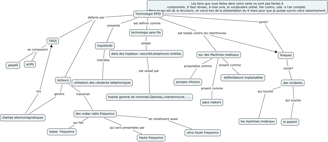 Cette carte conceptuelle, cree avec IHMC CmapTools, contient des informations liees a : Cmap Abdeljalil Kaidi.cmap, inquietude interdise utilisation des celulaires telephoniques, TAGS se composent actifs, des ondes radio frequence se constituent aussi ultra haute frequence, des ondes radio frequence qui fait basse frequence, lecteurs genére champs electromagnetiques, des ondes radio frequence qui sont presentées par haute frequence, Technologie RFID est testée contre les interfrences Risques, Technologie RFID est testée contre les interfrences sur des Machines medicaux, sur des Machines medicaux presentées comme pompes infusion, dans des hopitaux :securité,telephones mobiles est utilisé par hopital general de montreal,Gatineau,charlesmoyne......, Technologie RFID defenie par lecteurs, Technologie RFID presente inquietude, lecteurs transmet des ondes radio frequence, Technologie RFID porte? Risques, Technologie RFID defenie par TAGS, des incidents qui touche les machines medicaux, champs electromagnetiques lire TAGS, sur des Machines medicaux prisent comme pace makers, Risques cause? des incidents, des incidents qui touche le patient