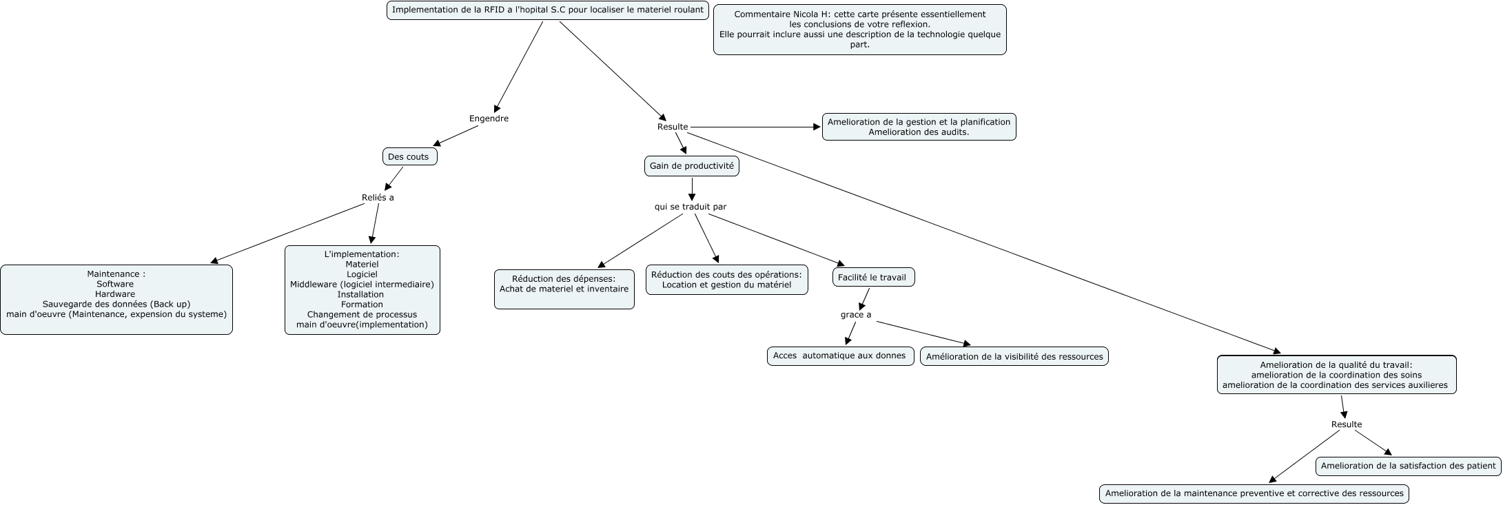 Cette carte conceptuelle, cree avec IHMC CmapTools, contient des informations liees a : RFID SC MBendekhis JLafourtune, Implementation de la RFID a l'hopital S.C pour localiser le materiel roulant Resulte Amelioration de la gestion et la planification Amelioration des audits., Implementation de la RFID a l'hopital S.C pour localiser le materiel roulant Resulte Gain de productivité, Gain de productivité qui se traduit par Facilité le travail, Facilité le travail grace a Acces automatique aux donnes, Implementation de la RFID a l'hopital S.C pour localiser le materiel roulant Resulte Amelioration de la qualité du travail: amelioration de la coordination des soins amelioration de la coordination des services auxilieres, Facilité le travail grace a Amélioration de la visibilité des ressources, Des couts Reliés a Maintenance : Software Hardware Sauvegarde des données (Back up) main d'oeuvre (Maintenance, expension du systeme), Des couts Reliés a L'implementation: Materiel Logiciel Middleware (logiciel intermediaire) Installation Formation Changement de processus main d'oeuvre(implementation), Amelioration de la qualité du travail: amelioration de la coordination des soins amelioration de la coordination des services auxilieres Resulte Amelioration de la maintenance preventive et corrective des ressources, Gain de productivité qui se traduit par Réduction des dépenses: Achat de materiel et inventaire, Amelioration de la qualité du travail: amelioration de la coordination des soins amelioration de la coordination des services auxilieres Resulte Amelioration de la satisfaction des patient, Implementation de la RFID a l'hopital S.C pour localiser le materiel roulant Engendre Des couts, Gain de productivité qui se traduit par Réduction des couts des opérations: Location et gestion du matériel