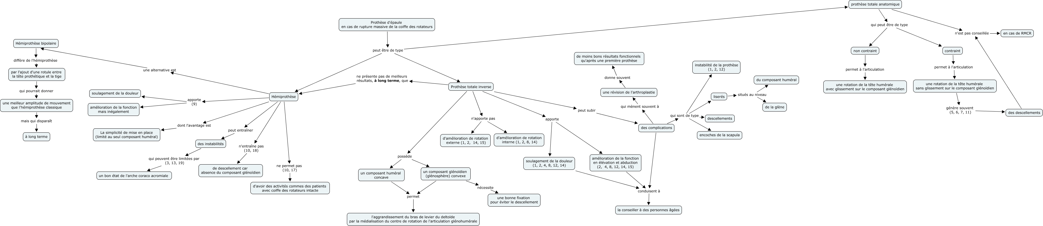 Cette carte de concepts créée avec IHMC CmapTools traite de: prothese epaule, un composant glénoïdien (glénosphère) convexe nécessite une bonne fixation pour éviter le descellement, Prothèse totale inverse apporte amélioration de la fonction en élévation et abduction (2, 4, 8, 12, 14, 15), Hémiprothèse apporte (9) amélioration de la fonction mais inégalement, une révision de l'arthroplastie donne souvent de moins bons résultats fonctionnels qu'après une première prothèse, des complications qui sont de type instabilité de la prothèse (1, 2, 12), des complications qui mènent souvent à une révision de l'arthroplastie, des complications qui sont de type encoches de la scapula, un composant huméral concave permet l'aggrandissement du bras de levier du deltoïde par la médialisation du centre de rotation de l'articulation glénohumérale, Prothèse totale inverse n'apporte pas d'amélioration de rotation externe (1, 2, 14, 15), Hémiprothèse peut entraîner des instabilités, liserés situés au niveau du composant huméral, Prothèse totale inverse ne présente pas de meilleurs résultats, à long terme, que Hémiprothèse, un composant glénoïdien (glénosphère) convexe permet l'aggrandissement du bras de levier du deltoïde par la médialisation du centre de rotation de l'articulation glénohumérale, une meilleur amplitude de mouvement que l'hémiprothèse classique mais qui disparaît à long terme, prothèse totale anatomique n'est pas conseillée en cas de RMCR, une rotation de la tête humérale sans glissement sur le composant glénoïdien génère souvent (5, 6, 7, 11) des descellements, Prothèse totale inverse possède un composant glénoïdien (glénosphère) convexe, des descellements n'est pas conseillée en cas de RMCR, des complications qui sont de type descellements, Prothèse d'épaule en cas de rupture massive de la coiffe des rotateurs peut être de type Prothèse totale inverse