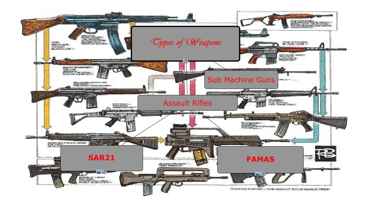 This Concept Map, created with IHMC CmapTools, has information related to: Ong CM for AMB005, Types of Weapons Sub Machine Guns, Assault Rifles FAMAS, Assault Rifles SAR21, Types of Weapons Assault Rifles