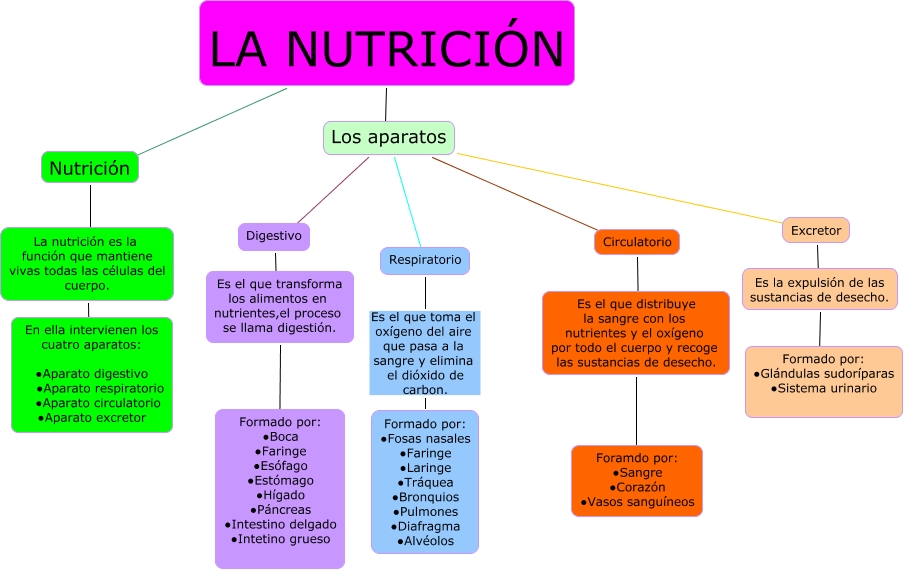 Este Cmap, tiene información relacionada con: tema 5 cono julia, Nutrición ???? La nutrición es la función que mantiene vivas todas las células del cuerpo., Respiratorio Es el que toma el oxígeno del aire que pasa a la sangre y elimina el dióxido de carbon. Formado por: ∙Fosas nasales ∙Faringe ∙Laringe ∙Tráquea ∙Bronquios ∙Pulmones ∙Diafragma ∙Alvéolos, Es el que distribuye la sangre con los nutrientes y el oxígeno por todo el cuerpo y recoge las sustancias de desecho. ???? Foramdo por: ∙Sangre ∙Corazón ∙Vasos sanguíneos, Los aparatos ???? Circulatorio, Los aparatos ???? Respiratorio, Es el que transforma los alimentos en nutrientes,el proceso se llama digestión. ???? Formado por: ∙Boca ∙Faringe ∙Esófago ∙Estómago ∙Hígado ∙Páncreas ∙Intestino delgado ∙Intetino grueso, Los aparatos ???? Excretor, Los aparatos ???? Digestivo, Circulatorio ???? Es el que distribuye la sangre con los nutrientes y el oxígeno por todo el cuerpo y recoge las sustancias de desecho., Es la expulsión de las sustancias de desecho. ???? Formado por: ∙Glándulas sudoríparas ∙Sistema urinario, Excretor ???? Es la expulsión de las sustancias de desecho., Digestivo ???? Es el que transforma los alimentos en nutrientes,el proceso se llama digestión., Es el que transforma los alimentos en nutrientes,el proceso se llama digestión. ???? Formado por: ∙Boca ∙Faringe ∙Esófago ∙Estómago ∙Hígado ∙Páncreas ∙Intestino delgado ∙Intetino grueso, LA NUTRICIÓN Los aparatos, La nutrición es la función que mantiene vivas todas las células del cuerpo. ???? En ella intervienen los cuatro aparatos: ∙Aparato digestivo ∙Aparato respiratorio ∙Aparato circulatorio ∙Aparato excretor, LA NUTRICIÓN ???? Nutrición