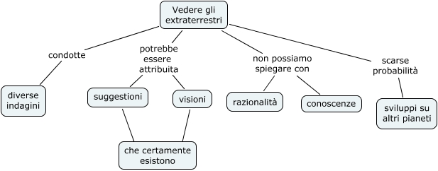 Questa Cmap, creata con IHMC CmapTools, contiene informazioni relative a: Vedere gli Extraterrestri, suggestioni ???? che certamente esistono, Vedere gli extraterrestri potrebbe essere attribuita visioni, Vedere gli extraterrestri non possiamo spiegare con razionalità, Vedere gli extraterrestri potrebbe essere attribuita suggestioni, visioni ???? che certamente esistono, Vedere gli extraterrestri scarse probabilità sviluppi su altri pianeti, Vedere gli extraterrestri condotte diverse indagini, Vedere gli extraterrestri non possiamo spiegare con conoscenze