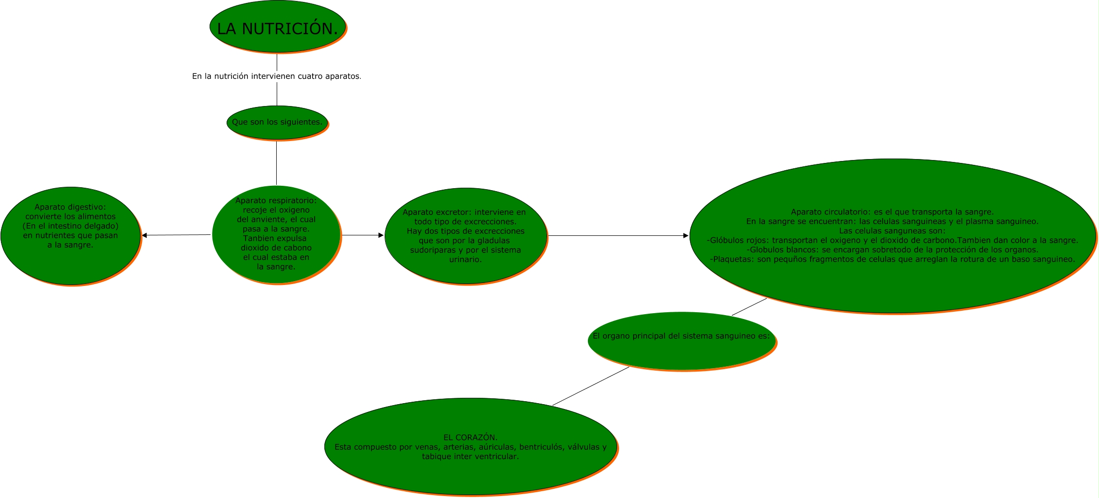 Este Cmap, tiene información relacionada con: LA NUTRICIÓN.POR JUANVI, Que son los siguientes. Aparato respiratorio: recoje el oxigeno del anviente, el cual pasa a la sangre. Tanbien expulsa dioxido de cabono el cual estaba en la sangre. Aparato excretor: interviene en todo tipo de excrecciones. Hay dos tipos de excrecciones que son por la gladulas sudoriparas y por el sistema urinario., LA NUTRICIÓN. En la nutrición intervienen cuatro aparatos. Que son los siguientes., Que son los siguientes. Aparato respiratorio: recoje el oxigeno del anviente, el cual pasa a la sangre. Tanbien expulsa dioxido de cabono el cual estaba en la sangre. Aparato digestivo: convierte los alimentos (En el intestino delgado) en nutrientes que pasan a la sangre., Aparato excretor: interviene en todo tipo de excrecciones. Hay dos tipos de excrecciones que son por la gladulas sudoriparas y por el sistema urinario. ???? Aparato circulatorio: es el que transporta la sangre. En la sangre se encuentran: las celulas sanguineas y el plasma sanguineo. Las celulas sanguneas son: -Glóbulos rojos: transportan el oxigeno y el dioxido de carbono.Tambien dan color a la sangre. -Globulos blancos: se encargan sobretodo de la protección de los organos. -Plaquetas: son pequños fragmentos de celulas que arreglan la rotura de un baso sanguineo., Aparato circulatorio: es el que transporta la sangre. En la sangre se encuentran: las celulas sanguineas y el plasma sanguineo. Las celulas sanguneas son: -Glóbulos rojos: transportan el oxigeno y el dioxido de carbono.Tambien dan color a la sangre. -Globulos blancos: se encargan sobretodo de la protección de los organos. -Plaquetas: son pequños fragmentos de celulas que arreglan la rotura de un baso sanguineo. El organo principal del sistema sanguineo es: EL CORAZÓN. Esta compuesto por venas, arterias, aúriculas, bentriculós, válvulas y tabique inter ventricular.