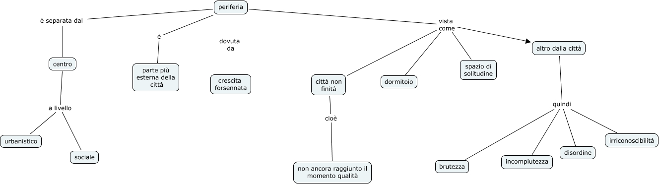 Questa Cmap, creata con IHMC CmapTools, contiene informazioni relative a: trattazione_periferia, altro dalla città quindi incompiutezza, altro dalla città quindi brutezza, centro a livello urbanistico, periferia vista come città non finità, periferia è parte più esterna della città, altro dalla città quindi irriconoscibilità, città non finità cioè non ancora raggiunto il momento qualità, periferia vista come dormitoio, periferia vista come altro dalla città, periferia dovuta da crescita forsennata, periferia vista come spazio di solitudine, periferia è separata dal centro, centro a livello sociale, altro dalla città quindi disordine