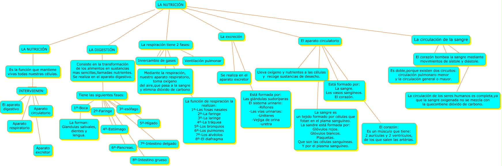 Este Cmap, tiene información relacionada con: Cono tema 5 luis lópez díez, LA NUTRICIÓN ???? La excreción, La circulación de la sangre ???? El corazón bombea la sangre mediante movimientos de sístole y diástole., Tiene las siguientes fases: ???? 6º-Pancreas., LA NUTRICIÓN ???? El aparato circulatorio, El aparato circulatorio ???? Lleva oxígeno y nutrientes a las células y recoge sustancias de desecho., El aparato circulatorio ???? Está formado por: La sangre. Los vasos sangíneos. El corazón., La excreción ???? Se realiza en el aparato excretor, LA NUTRICIÓN ???? LA DIGESTIÓN, La respiración tiene 2 fases: ???? Ventilación pulmonar, LA NUTRICIÓN ???? Es la función que mantiene vivas todas nuestras células., Tiene las siguientes fases: ???? 4º-Estómago, LA NUTRICIÓN ???? La circulación de la sangre, INTERVIENEN: ???? Aparato excretor, La respiración tiene 2 fases: ???? Mediante la respiración, nuestro aparato respiratorio, toma oxígeno del aire,que pasa a la sangre y elimina dióxido de carbono, Tiene las siguientes fases: ???? 1º-Boca, La respiración tiene 2 fases: ???? La función de respiración la realizan: 1º-Las fosas nasales 2º-La faringe 3º-La laringe 4º-La tráquea 5º-Los bronquios 6º-Los pulmones 7º-Los alvéolos 8º-El diafragma, 1º-Boca ???? La forman: Glandulas salivales, dientes y lengua., La circulación de la sangre ???? Es doble,porque existen dos circuitos: circulación pulmonaro menor y la circulación general o mayor., Consiste en la transformación de los alimentos en sustancias mas sencillas,llamadas nutrientes. Se realiza en el aparato digestivo. ???? Tiene las siguientes fases:, Tiene las siguientes fases: ???? 2º-Faringe