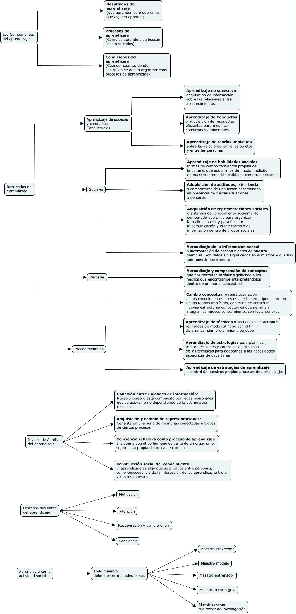 Este Cmap, tiene información relacionada con: El sistema de aprendizaje, Sociales Adquisición de actitudes, o tendencia a comportarse de una forma determinada en presencia de ciertas situaciones o personas, Aprendizaje como actividad social Todo maestro debe ejercer múltiples tareas, Los Componentes del aprendizaje Condiciones del aprendizaje (Cuándo, cuánto, donde, con quien se deben organizar esos procesos de aprendizaje), Todo maestro debe ejercer múltiples tareas Maestro tutor o guía, Sociales Aprendizaje de habilidades sociales, formas de comportamientos propias de la cultura, que adquirimos de modo implícito en nuestra interacción cotidiana con otras personas, Verbales Aprendizaje de la información verbal o incorporación de hechos y datos de nuestra memoria. Son datos sin significados en si mismos y que hay que repertir literalmente, Resultados del aprendizaje Procedimentales, Procesos auxiliares del aprendizaje Recuperación y transferencia, Niveles de Análisis del aprendizaje Adquisición y cambio de representaciones: Consiste en una serie de memorias conectadas a través de ciertos procesos, Procedimentales Aprendizaje de estrategias de aprendizaje o control de nuestros propios procesos de aprendizaje., Procedimentales Aprendizaje de estrategias para planificar, tomar decisiones y controlar la aplicación de las técniacas para adaptarlas a las necesidades específicas de cada tarea, Los Componentes del aprendizaje Procesos del aprendizaje (Como se aprende o se buscan esos resultados), Niveles de Análisis del aprendizaje Conexión entre unidades de información: Nuestro cerebro está compuesto por redes neuronales que se acitvan o no dependiendo de la estimulación recibida, Resultados del aprendizaje Sociales, Procesos auxiliares del aprendizaje Conciencia, Resultados del aprendizaje Verbales, Verbales Cambio conceptual o reestructuración de los conocimientos previos que tienen origen sobre todo en las teorías implícitas, con el fin de construir nuevas estructuras conceptuales que permitan integrar los nuevos conocimientos con los anteriores., Sociales Adquisición de representaciones sociales o sistemas de conocimiento socialmente compartido que sirve para organizar la realidad social y para facilitar la comunicación y el intercambio de información dentro de grupos sociales, Los Componentes del aprendizaje Resultados del aprendizaje (que aprendemos o queremos que alguien aprenda), Aprendizaje de sucesos y conductas Conductuales Aprendizaje de teorías implícitas sobre las relaciones entre los objetos y entre las personas