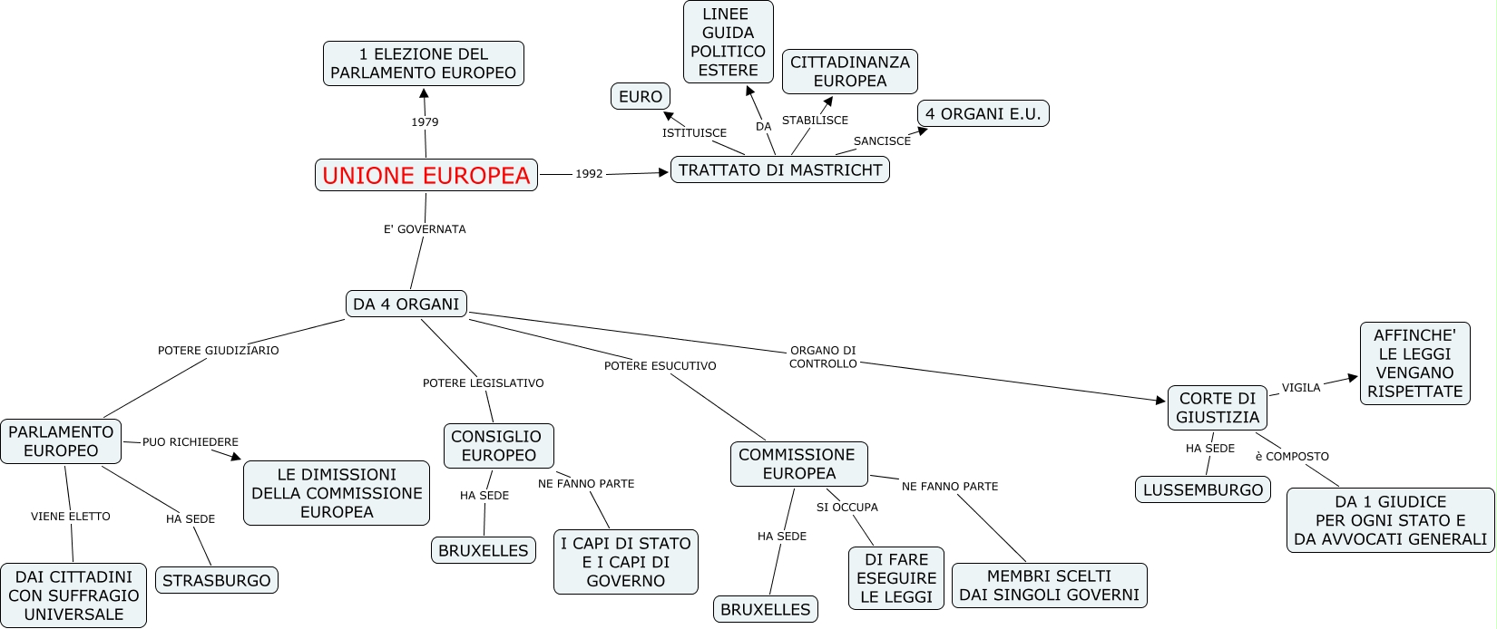 Questa Cmap, creata con IHMC CmapTools, contiene informazioni relative a: ORGANI EU-Morelli Anadre, PARLAMENTO EUROPEO PUO RICHIEDERE LE DIMISSIONI DELLA COMMISSIONE EUROPEA, CORTE DI GIUSTIZIA HA SEDE LUSSEMBURGO, COMMISSIONE EUROPEA NE FANNO PARTE MEMBRI SCELTI DAI SINGOLI GOVERNI, UNIONE EUROPEA 1992 TRATTATO DI MASTRICHT, DA 4 ORGANI POTERE LEGISLATIVO CONSIGLIO EUROPEO, UNIONE EUROPEA E' GOVERNATA DA 4 ORGANI, COMMISSIONE EUROPEA SI OCCUPA DI FARE ESEGUIRE LE LEGGI, CORTE DI GIUSTIZIA è COMPOSTO DA 1 GIUDICE PER OGNI STATO E DA AVVOCATI GENERALI, TRATTATO DI MASTRICHT ISTITUISCE EURO, TRATTATO DI MASTRICHT SANCISCE 4 ORGANI E.U., PARLAMENTO EUROPEO HA SEDE STRASBURGO, DA 4 ORGANI POTERE GIUDIZIARIO PARLAMENTO EUROPEO, PARLAMENTO EUROPEO VIENE ELETTO DAI CITTADINI CON SUFFRAGIO UNIVERSALE, TRATTATO DI MASTRICHT DA LINEE GUIDA POLITICO ESTERE, UNIONE EUROPEA 1979 1 ELEZIONE DEL PARLAMENTO EUROPEO, DA 4 ORGANI POTERE ESUCUTIVO COMMISSIONE EUROPEA, COMMISSIONE EUROPEA HA SEDE BRUXELLES, CONSIGLIO EUROPEO HA SEDE BRUXELLES, CORTE DI GIUSTIZIA VIGILA AFFINCHE' LE LEGGI VENGANO RISPETTATE, DA 4 ORGANI ORGANO DI CONTROLLO CORTE DI GIUSTIZIA