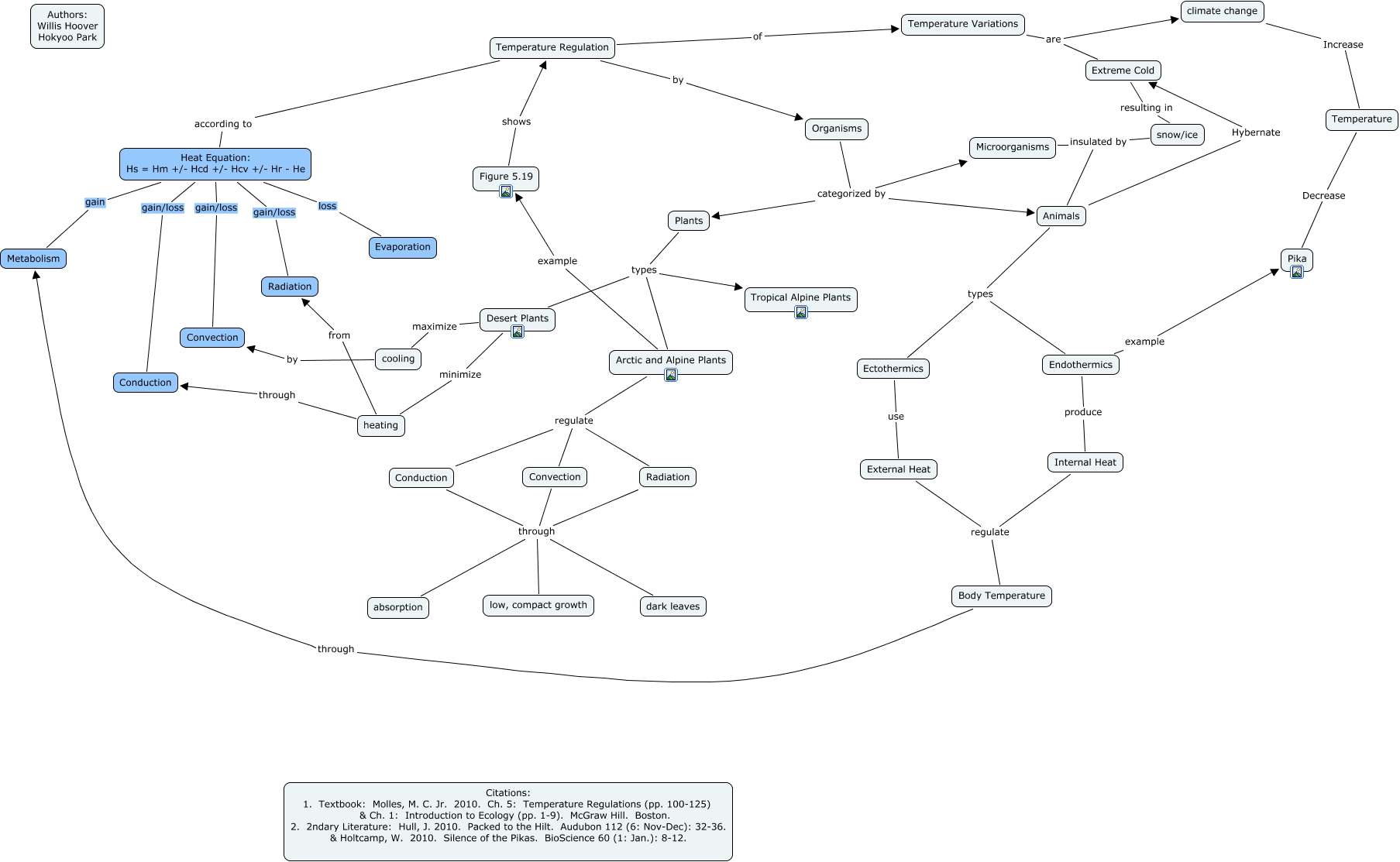 This Concept Map, created with IHMC CmapTools, has information related to: WH QP temp reg, Temperature Variations are climate change, Animals types Ectothermics, Desert Plants maximize cooling, Figure 5.19 shows Temperature Regulation, Temperature Variations are Extreme Cold, Temperature Regulation by Organisms, Ectothermics use External Heat, Organisms categorized by Plants, Plants types Arctic and Alpine Plants, Arctic and Alpine Plants example Figure 5.19, Internal Heat regulate Body Temperature, Temperature Regulation according to Heat Equation: Hs = Hm +/- Hcd +/- Hcv +/- Hr - He, Heat Equation: Hs = Hm +/- Hcd +/- Hcv +/- Hr - He gain/loss Conduction, Temperature Decrease Pika, heating from Radiation, dark leaves through low, compact growth, External Heat regulate Body Temperature, Desert Plants minimize heating, Heat Equation: Hs = Hm +/- Hcd +/- Hcv +/- Hr - He loss Evaporation, Heat Equation: Hs = Hm +/- Hcd +/- Hcv +/- Hr - He gain Metabolism