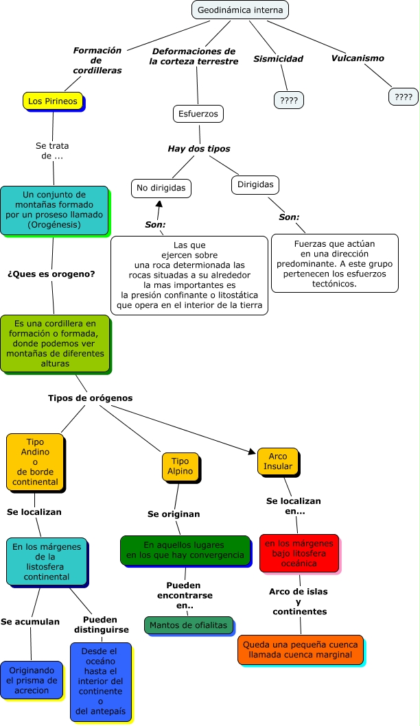 Este Cmap, tiene información relacionada con: Geodinámica interna Juanjo 4º, en los márgenes bajo litosfera oceánica Arco de islas y continentes Queda una pequeña cuenca llamada cuenca marginal, Esfuerzos Hay dos tipos Dirigidas, Las que ejercen sobre una roca determionada las rocas situadas a su alrededor la mas importantes es la presión confinante o litostática que opera en el interior de la tierra Son: No dirigidas, Dirigidas Son: Fuerzas que actúan en una dirección predominante. A este grupo pertenecen los esfuerzos tectónicos., Geodinámica interna Deformaciones de la corteza terrestre Esfuerzos, En los márgenes de la listosfera continental Se acumulan Originando el prisma de acrecion, Es una cordillera en formación o formada, donde podemos ver montañas de diferentes alturas Tipos de orógenos Arco Insular, Un conjunto de montañas formado por un proseso llamado (Orogénesis) ¿Ques es orogeno? Es una cordillera en formación o formada, donde podemos ver montañas de diferentes alturas, Es una cordillera en formación o formada, donde podemos ver montañas de diferentes alturas Tipos de orógenos Tipo Alpino, Tipo Andino o de borde continental Se localizan En los márgenes de la listosfera continental, Geodinámica interna Sismicidad ????, Tipo Alpino Se originan En aquellos lugares en los que hay convergencia, Arco Insular Se localizan en... en los márgenes bajo litosfera oceánica, En aquellos lugares en los que hay convergencia Pueden encontrarse en.. Mantos de ofialitas, Geodinámica interna Vulcanismo ????, Es una cordillera en formación o formada, donde podemos ver montañas de diferentes alturas Tipos de orógenos Tipo Andino o de borde continental, Los Pirineos Se trata de ... Un conjunto de montañas formado por un proseso llamado (Orogénesis), Esfuerzos Hay dos tipos No dirigidas, Geodinámica interna Formación de cordilleras Los Pirineos, En los márgenes de la listosfera continental Pueden distinguirse Desde el oceáno hasta el interior del continente o del antepaís