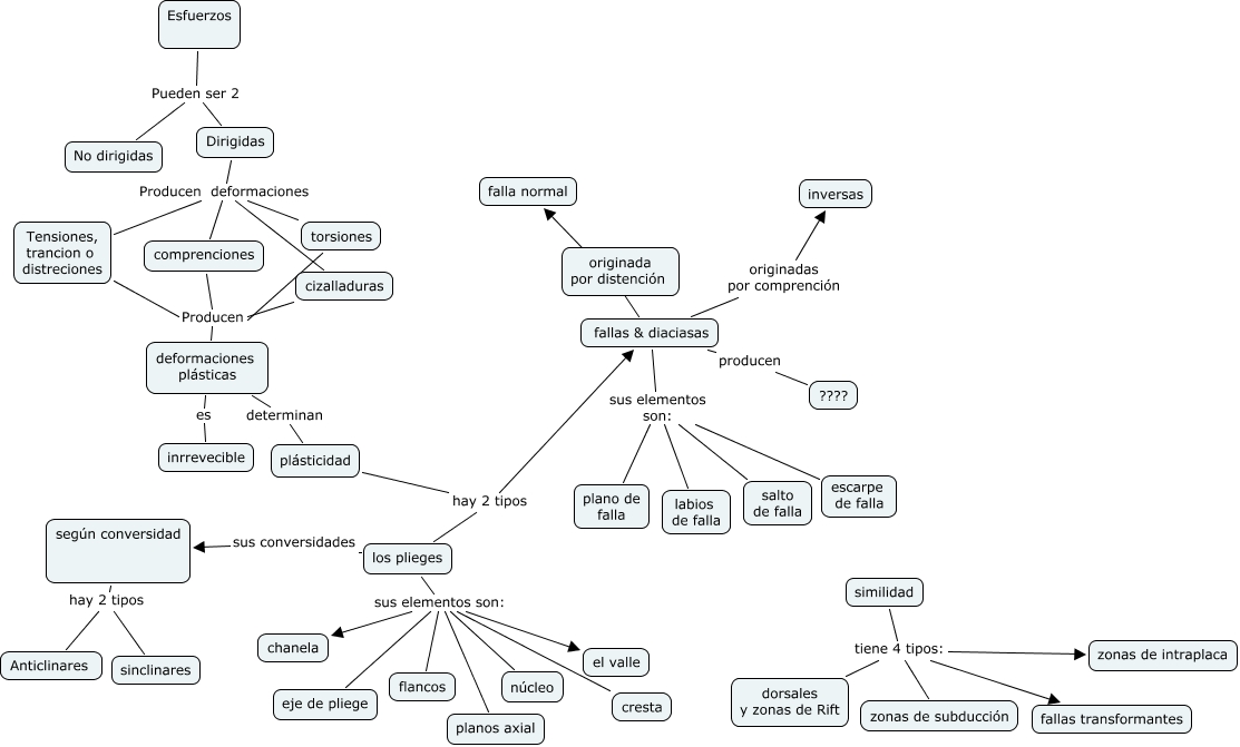 Este Cmap, tiene información relacionada con: María-geodinamica interna, fallas & diaciasas sus elementos son: escarpe de falla, Esfuerzos Pueden ser 2 No dirigidas, Tensiones, trancion o distreciones Producen deformaciones plásticas, fallas & diaciasas producen ????, los plieges sus elementos son: cresta, fallas & diaciasas sus elementos son: salto de falla, según conversidad hay 2 tipos sinclinares, los plieges sus elementos son: núcleo, similidad tiene 4 tipos: dorsales y zonas de Rift, fallas & diaciasas sus elementos son: plano de falla, los plieges sus elementos son: flancos, cizalladuras Producen deformaciones plásticas, torsiones Producen deformaciones plásticas, los plieges sus elementos son: planos axial, fallas & diaciasas falla normal, plásticidad hay 2 tipos los plieges, según conversidad hay 2 tipos Anticlinares, fallas & diaciasas sus elementos son: labios de falla, los plieges sus elementos son: chanela, deformaciones plásticas determinan plásticidad