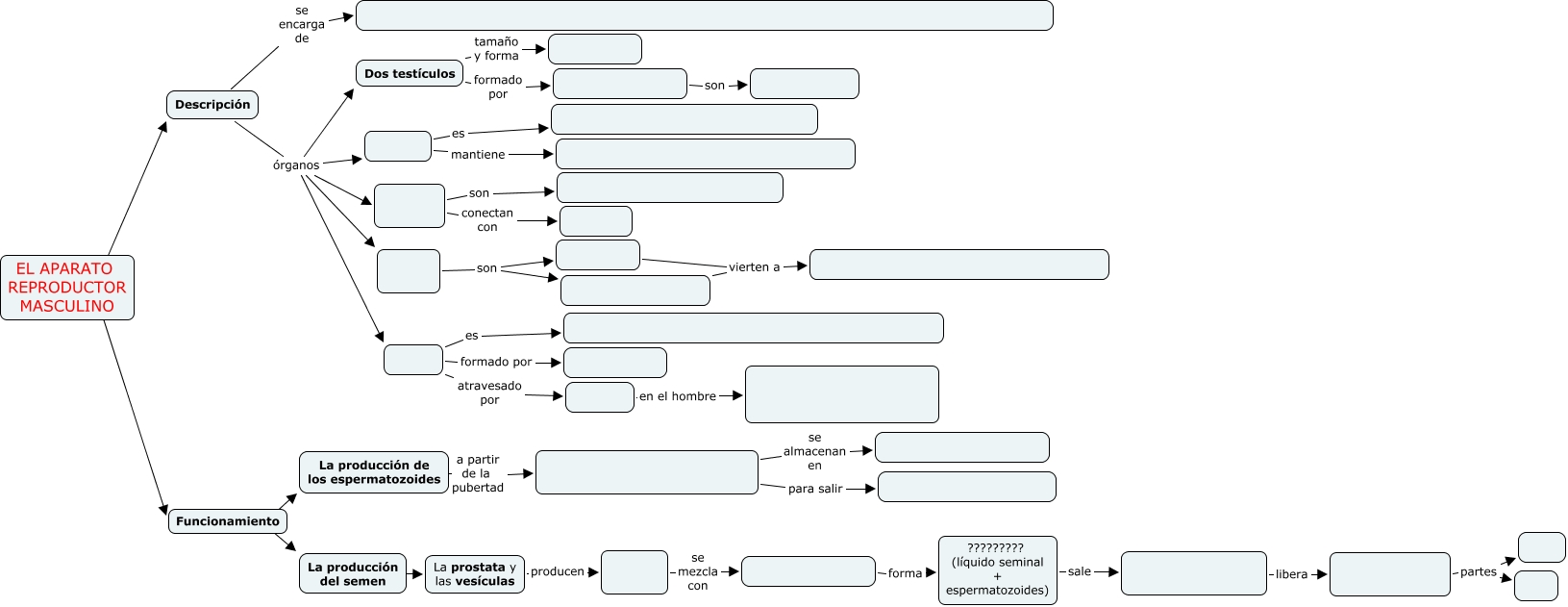 Este Cmap, tiene información relacionada con: El aparato reproductor masculino 1, La producción del semen ???? La prostata y las vesículas, Funcionamiento ???? La producción del semen, son, Descripción órganos, en el hombre, Descripción órganos, son, conectan con, partes, vierten a, Descripción se encarga de, libera, Descripción órganos, Descripción órganos Dos testículos, EL APARATO REPRODUCTOR MASCULINO ???? Funcionamiento, es, forma ????????? (líquido seminal + espermatozoides), ????????? (líquido seminal + espermatozoides) sale, Dos testículos tamaño y forma, Funcionamiento ???? La producción de los espermatozoides