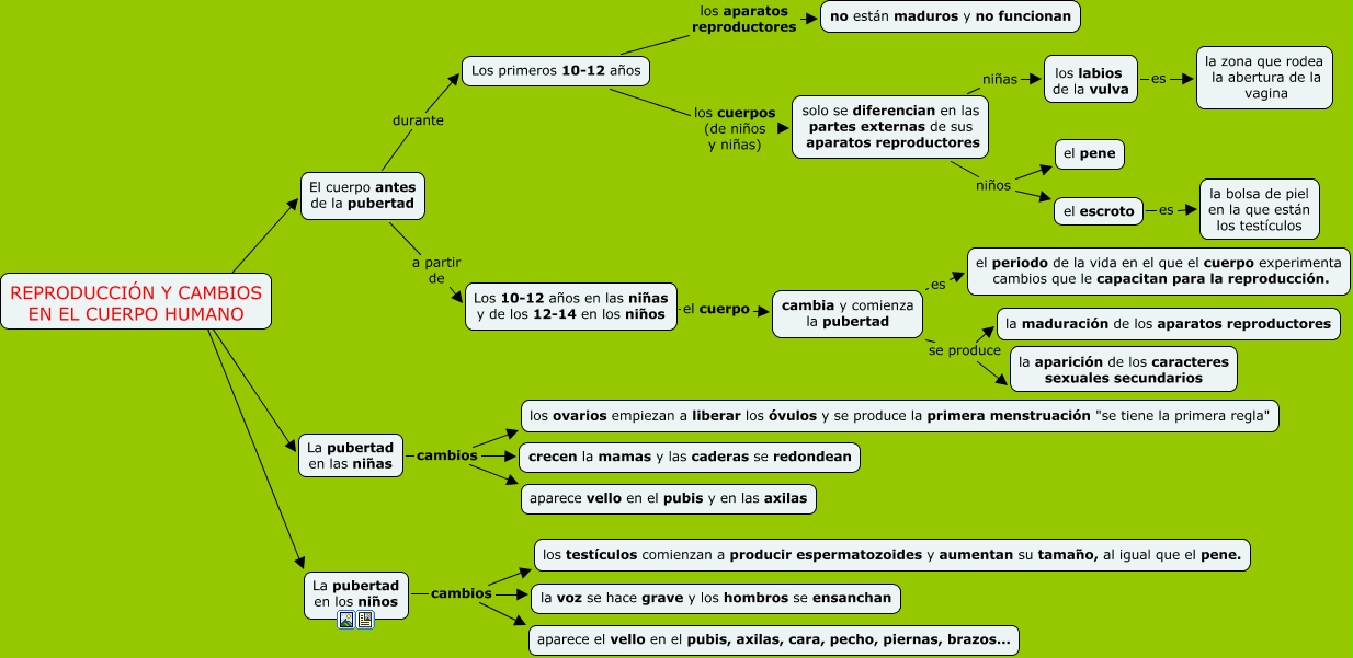 Este Cmap, tiene información relacionada con: Reproducción y cambios en el cuerpo humano 2, cambia y comienza la pubertad es el periodo de la vida en el que el cuerpo experimenta cambios que le capacitan para la reproducción., REPRODUCCIÓN Y CAMBIOS EN EL CUERPO HUMANO ???? La pubertad en los niños, REPRODUCCIÓN Y CAMBIOS EN EL CUERPO HUMANO ???? El cuerpo antes de la pubertad, Los primeros 10-12 años los aparatos reproductores no están maduros y no funcionan, La pubertad en los niños cambios aparece el vello en el pubis, axilas, cara, pecho, piernas, brazos..., La pubertad en las niñas cambios aparece vello en el pubis y en las axilas, La pubertad en las niñas cambios crecen la mamas y las caderas se redondean, El cuerpo antes de la pubertad a partir de Los 10-12 años en las niñas y de los 12-14 en los niños, solo se diferencian en las partes externas de sus aparatos reproductores niñas los labios de la vulva, el escroto es la bolsa de piel en la que están los testículos, La pubertad en las niñas cambios los ovarios empiezan a liberar los óvulos y se produce la primera menstruación "se tiene la primera regla", La pubertad en los niños cambios la voz se hace grave y los hombros se ensanchan, El cuerpo antes de la pubertad durante Los primeros 10-12 años, Los 10-12 años en las niñas y de los 12-14 en los niños el cuerpo cambia y comienza la pubertad, solo se diferencian en las partes externas de sus aparatos reproductores niños el escroto, Los primeros 10-12 años los cuerpos (de niños y niñas) solo se diferencian en las partes externas de sus aparatos reproductores, La pubertad en los niños cambios los testículos comienzan a producir espermatozoides y aumentan su tamaño, al igual que el pene., REPRODUCCIÓN Y CAMBIOS EN EL CUERPO HUMANO ???? La pubertad en las niñas, los labios de la vulva es la zona que rodea la abertura de la vagina, cambia y comienza la pubertad se produce la aparición de los caracteres sexuales secundarios