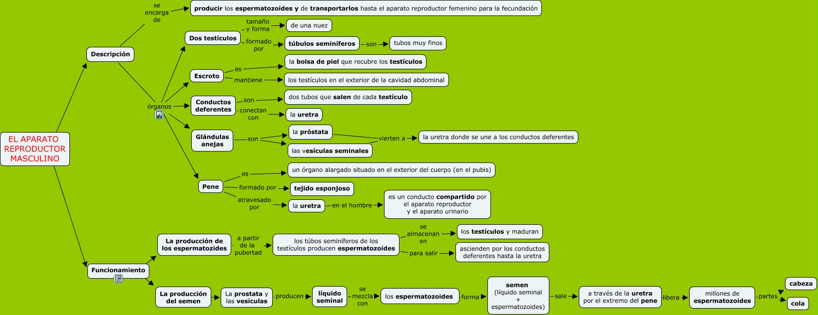 Este Cmap, tiene información relacionada con: El aparato reproductor masculino 2, La producción del semen ???? La prostata y las vesículas, Funcionamiento ???? La producción del semen, Descripción órganos Conductos deferentes, Glándulas anejas son la próstata, Conductos deferentes son dos tubos que salen de cada testículo, Descripción órganos Glándulas anejas, la uretra en el hombre es un conducto compartido por el aparato reproductor y el aparato urinario, millones de espermatozoides partes cola, Conductos deferentes conectan con la uretra, Descripción se encarga de producir los espermatozoides y de transportarlos hasta el aparato reproductor femenino para la fecundación, las vesículas seminales vierten a la uretra donde se une a los conductos deferentes, a través de la uretra por el extremo del pene libera millones de espermatozoides, Descripción órganos Dos testículos, Descripción órganos Escroto, EL APARATO REPRODUCTOR MASCULINO ???? Funcionamiento, los espermatozoides forma semen (líquido seminal + espermatozoides), Escroto es la bolsa de piel que recubre los testículos, semen (líquido seminal + espermatozoides) sale a través de la uretra por el extremo del pene, Dos testículos tamaño y forma de una nuez, Funcionamiento ???? La producción de los espermatozides