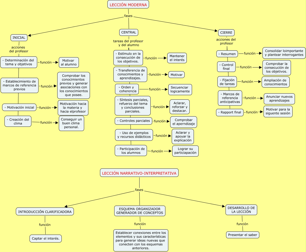 Este Cmap, tiene información relacionada con: Partes de la lección y sus funciones, INICIAL acciones del profesor - Creación del clima, - Motivación inicial función Motivación hacia la materia y hacia elprofesor, CIERRE acciones del profesor - Rapport final, DESARROLLO DE LA LECCIÓN función Presentar el saber, INTRODUCCIÓN CLARIFICADORA función Captar el interés., ESQUEMA ORGANIZADOR GENERADOR DE CONCEPTOS función Establecer conexiones entre los elementos y sus características para generar ideas nuevas que conecten con los esquemas anteriores., - Determinación del tema y objetivos función Motivar al alumno, - Estímulo en la consecución de los objetivos. función Mantener el interés, LECCIÓN MODERNA fases INICIAL, - Orden y coherencia función Secuenciar logicamente, - Resumen función Consolidar loimportante y plantear interrogantes, LECCIÓN MODERNA fases CIERRE, CENTRAL tareas del profesor y del alumno - Estímulo en la consecución de los objetivos., LECCIÓN MODERNA fases CENTRAL, - Controles parciales función Comprobar el aperndizaje, LECCIÓN NARRATIVO-INTERPRETATIVA fases ESQUEMA ORGANIZADOR GENERADOR DE CONCEPTOS, - Creación del clima función Conseguir un buen clima personal., - Uso de ejemplos y recursos didácticos función Aclarar y apoyar la explicación, - Transferencia de conocimientos y aprendizajes. función Motivar, INICIAL acciones del profesor - Determinación del tema y objetivos