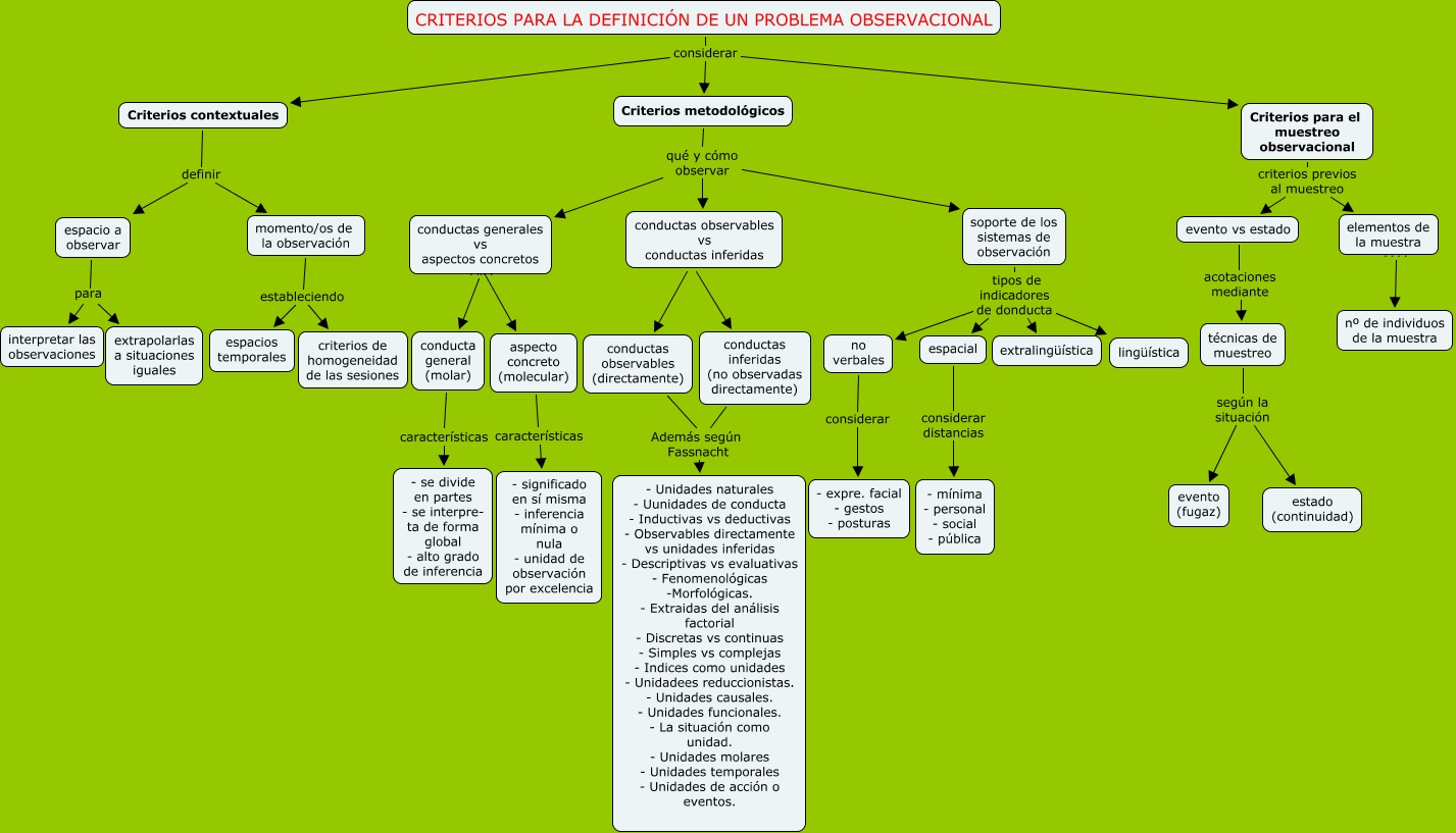 Este Cmap, tiene información relacionada con: Criteros para la definición de un problema observacional, soporte de los sistemas de observación tipos de indicadores de donducta espacial, CRITERIOS PARA LA DEFINICIÓN DE UN PROBLEMA OBSERVACIONAL considerar Criterios contextuales, conducta general (molar) características - se divide en partes - se interpre- ta de forma global - alto grado de inferencia, momento/os de la observación estableciendo criterios de homogeneidad de las sesiones, Criterios para el muestreo observacional criterios previos al muestreo elementos de la muestra, CRITERIOS PARA LA DEFINICIÓN DE UN PROBLEMA OBSERVACIONAL considerar Criterios metodológicos, espacio a observar para interpretar las observaciones, aspecto concreto (molecular) características - significado en sí misma - inferencia mínima o nula - unidad de observación por excelencia, conductas observables (directamente) Además según Fassnacht - Unidades naturales - Uunidades de conducta - Inductivas vs deductivas - Observables directamente vs unidades inferidas - Descriptivas vs evaluativas - Fenomenológicas -Morfológicas. - Extraidas del análisis factorial - Discretas vs continuas - Simples vs complejas - Indices como unidades - Unidadees reduccionistas. - Unidades causales. - Unidades funcionales. - La situación como unidad. - Unidades molares - Unidades temporales - Unidades de acción o eventos., Criterios para el muestreo observacional criterios previos al muestreo evento vs estado, conductas observables vs conductas inferidas ???? conductas inferidas (no observadas directamente), conductas observables vs conductas inferidas ???? conductas observables (directamente), técnicas de muestreo según la situación estado (continuidad), soporte de los sistemas de observación tipos de indicadores de donducta lingüística, soporte de los sistemas de observación tipos de indicadores de donducta extralingüística, conductas generales vs aspectos concretos ???? conducta general (molar), espacio a observar para extrapolarlas a situaciones iguales, momento/os de la observación estableciendo espacios temporales, evento vs estado acotaciones mediante técnicas de muestreo, Criterios contextuales definir espacio a observar