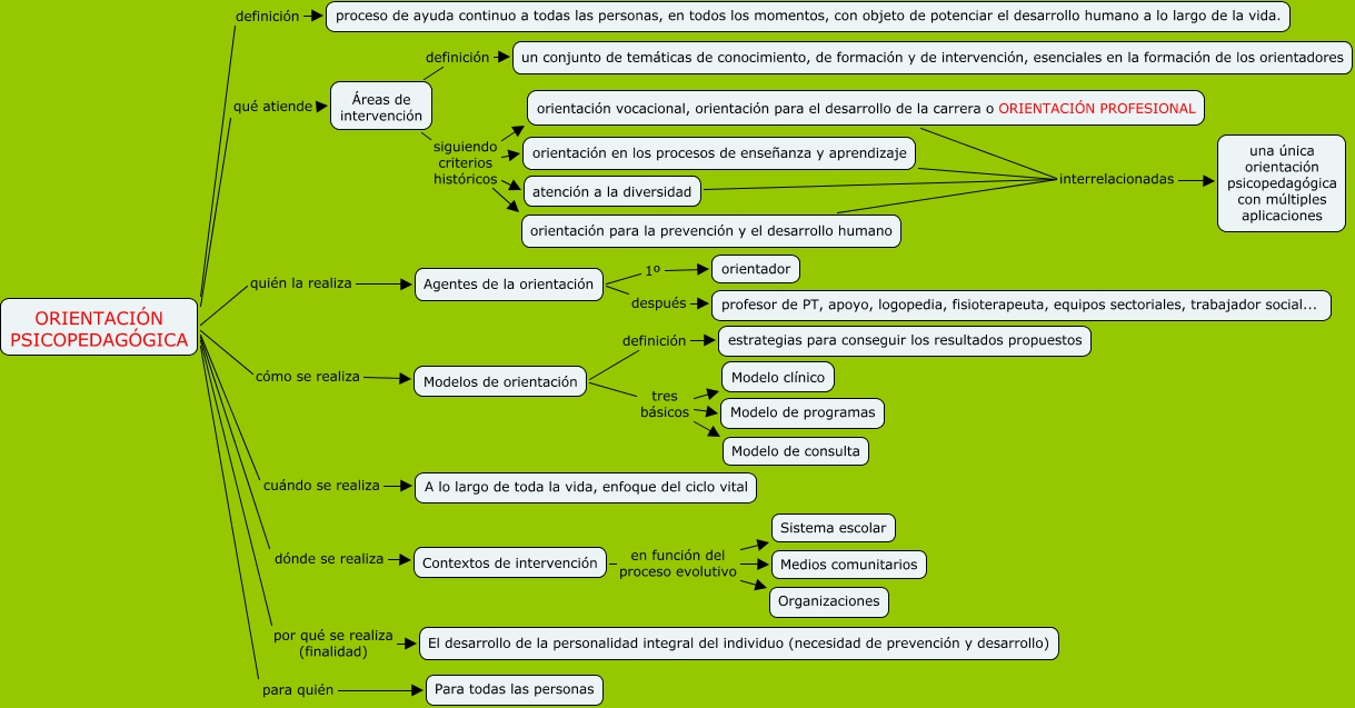 Este Cmap, tiene información relacionada con: Orientación psicopedagógica, Áreas de intervención siguiendo criterios históricos orientación en los procesos de enseñanza y aprendizaje, ORIENTACIÓN PSICOPEDAGÓGICA definición proceso de ayuda continuo a todas las personas, en todos los momentos, con objeto de potenciar el desarrollo humano a lo largo de la vida., ORIENTACIÓN PSICOPEDAGÓGICA qué atiende Áreas de intervención, Modelos de orientación definición estrategias para conseguir los resultados propuestos, orientación para la prevención y el desarrollo humano interrelacionadas una única orientación psicopedagógica con múltiples aplicaciones, Modelos de orientación tres básicos Modelo clínico, ORIENTACIÓN PSICOPEDAGÓGICA quién la realiza Agentes de la orientación, ORIENTACIÓN PSICOPEDAGÓGICA por qué se realiza (finalidad) El desarrollo de la personalidad integral del individuo (necesidad de prevención y desarrollo), Agentes de la orientación 1º orientador, Contextos de intervención en función del proceso evolutivo Organizaciones, ORIENTACIÓN PSICOPEDAGÓGICA cuándo se realiza A lo largo de toda la vida, enfoque del ciclo vital, orientación vocacional, orientación para el desarrollo de la carrera o ORIENTACIÓN PROFESIONAL interrelacionadas una única orientación psicopedagógica con múltiples aplicaciones, Modelos de orientación tres básicos Modelo de programas, ORIENTACIÓN PSICOPEDAGÓGICA para quién Para todas las personas, ORIENTACIÓN PSICOPEDAGÓGICA cómo se realiza Modelos de orientación, Áreas de intervención siguiendo criterios históricos orientación vocacional, orientación para el desarrollo de la carrera o ORIENTACIÓN PROFESIONAL, Contextos de intervención en función del proceso evolutivo Medios comunitarios, Áreas de intervención siguiendo criterios históricos atención a la diversidad, orientación en los procesos de enseñanza y aprendizaje interrelacionadas una única orientación psicopedagógica con múltiples aplicaciones, Modelos de orientación tres básicos Modelo de consulta