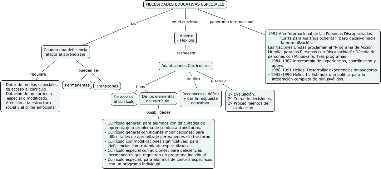 Este Cmap, tiene información relacionada con: NEE, Adaptaciones Curriculares implica Reconocer el déficit y dar la respuesta educativa., Adaptaciones Curriculares tipos De acceso al currículo, NECESIDADES EDUCATIVAS ESPECIALES en el currículo - Abierto - Flexible, De los elementos del currículo. posibilidades - Currículo general: para alumnos con dificultades de aprendizaje o problema de conducta transitorias. - Currículo general con algunas modificaciones: para dificultades de aprendizaje permanentes sin trastorno. - Currículo con modificaciones significativas: para deficiencias con tratamiento especializado. - Currículo especial con adiciones: para deficiencias permanentes que requieran un programa individual. - Currículo especial: para alumnos de centros específicos con un programa individual., Adaptaciones Curriculares tipos De los elementos del currículo., - Abierto - Flexible respuesta Adaptaciones Curriculares, Cuando una deficiencia afecta al aprendizaje pueden ser Transitorias, NECESIDADES EDUCATIVAS ESPECIALES panorama internacional 1981 Año Internacional de las Personas Discapacitadas. "Carta para los años ochenta": paso decisivo hacia la normalización. Las Naciones Unidas proclaman el "Programa de Acción Mundial para las Personas con Discapacidad": Década de personas con Minusvalía. Tres programas - 1984-1987 intercambio de experiencias, coordinación y apoyo. - 1988-1991 Helios. Desarrollar experiencias innovadoras. - 1992-1996 Helios II. Estimula una política para la integración completa de minusválidos., Adaptaciones Curriculares proceso 1º Evaluación. 2º Toma de decisiones. 3º Procedimientos de evaluación., Cuando una deficiencia afecta al aprendizaje pueden ser Permanentes, NECESIDADES EDUCATIVAS ESPECIALES hay Cuando una deficiencia afecta al aprendizaje, Cuando una deficiencia afecta al aprendizaje requiere - Dotar de medios especiales de acceso al currículo. - Dotación de un currículo especial o modificado. - Atención a la estructura social y al clima emocional