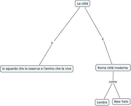 Questa Cmap, creata con IHMC CmapTools, contiene informazioni relative a: La Città, Roma città moderna come New York, Roma città moderna come Londra, La città è lo sguardo che lo osserva e l'animo che la vive, La città è Roma città moderna