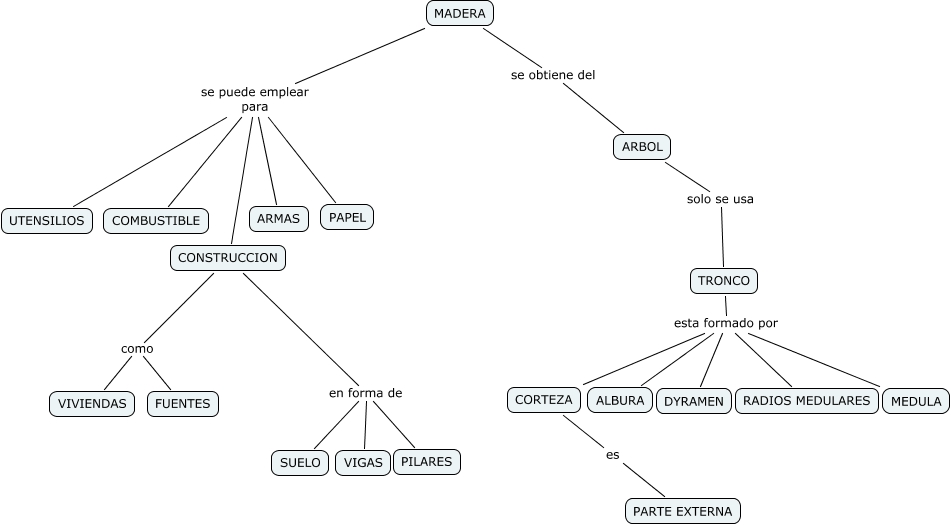 Este Cmap, tiene información relacionada con: MADERA_NACHO LOPEZ, TRONCO esta formado por RADIOS MEDULARES, MADERA se puede emplear para COMBUSTIBLE, CORTEZA es PARTE EXTERNA, MADERA se puede emplear para PAPEL, CONSTRUCCION en forma de PILARES, MADERA se puede emplear para ARMAS, ARBOL solo se usa TRONCO, CONSTRUCCION como FUENTES, TRONCO esta formado por DYRAMEN, MADERA se obtiene del ARBOL, TRONCO esta formado por CORTEZA, CONSTRUCCION como VIVIENDAS, CONSTRUCCION en forma de SUELO, MADERA se puede emplear para CONSTRUCCION, TRONCO esta formado por MEDULA, CONSTRUCCION en forma de VIGAS, MADERA se puede emplear para UTENSILIOS, TRONCO esta formado por ALBURA