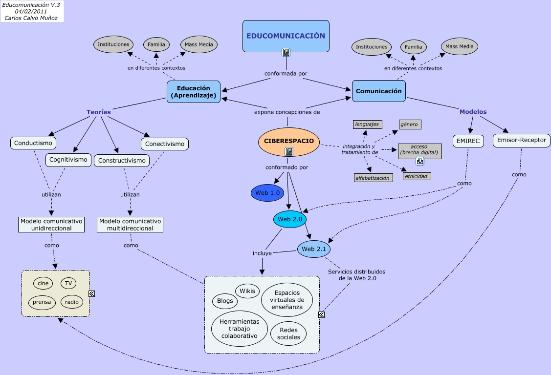 Este Cmap, tiene información relacionada con: Educomunicacion3, CIBERESPACIO conformado por Web 1.0, EDUCOMUNICACIÓN conformada por Comunicación, CIBERESPACIO integración y tratamiento de lenguajes, CIBERESPACIO integración y tratamiento de género, Comunicación en diferentes contextos Familia, EMIREC como Web 2.0, Modelo comunicativo unidireccional como Mass Media, Conectivismo utilizan Modelo comunicativo multidireccional, Constructivismo utilizan Modelo comunicativo multidireccional, Comunicación Modelos EMIREC, CIBERESPACIO expone concepciones de Educación (Aprendizaje), Comunicación Modelos Emisor-Receptor, Cognitivismo utilizan Modelo comunicativo unidireccional, Educación (Aprendizaje) en diferentes contextos Instituciones, Web 2.0 incluye Interacción, CIBERESPACIO conformado por Web 2.1, Conductismo utilizan Modelo comunicativo unidireccional, Educación (Aprendizaje) Teorías Cognitivismo, Educación (Aprendizaje) Teorías Conectivismo, Modelo comunicativo multidireccional como Interacción