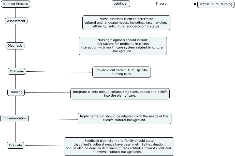 This Concept Map, created with IHMC CmapTools, has information related to: Pendleton, nursing theory, extra credit, Leininger ???? Nurse assesses client to determine cultural and language needs, including, race, religion, ethnicity, subculture, socioeconomic status, Outcome ???? Provide client with cultural specific nursing care., Assessment ???? Nurse assesses client to determine cultural and language needs, including, race, religion, ethnicity, subculture, socioeconomic status, Nursing Process ???? Evaluate, Leininger Theory Transcultural Nursing, Diagnosis ???? Nursing diagnosis should include risk factors for problems in clients interaction with health care system related to cultural background., Planning ???? Integrate clients unique culture, traditions, values and beliefs into the plan of care., Implementation ???? Implementation should be adapted to fit the needs of the client's cultural background., Evaluate ???? Feedback from client and family should state that client's cultural needs have been met. Self-evaluation should also be done to determine nurses attitudes toward client and diverse cultural backgrounds.