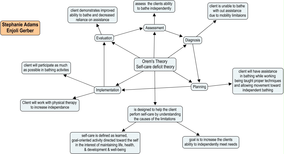 Nursing Theory - Adam & Gerber, Evaluation ???? client demonstrates improved ability to bathe and decreased reliance on assistance, Orem's Theory Self-care deficit theory ???? Assessment, Diagnosis ???? client is unable to bathe with out assistance due to mobility limitaions, Diagnosis ???? Planning, is designed to help the client perfom self-care by understanding the causes of the limitations ???? goal is to increase the clients ability to independently meet needs, Implementation ???? Evaluation, Assessment ???? assess the clients ability to bathe independently, Implementation ???? Client will work with physical therapy to increase independance, Orem's Theory Self-care deficit theory ???? Planning, Evaluation ???? Assessment