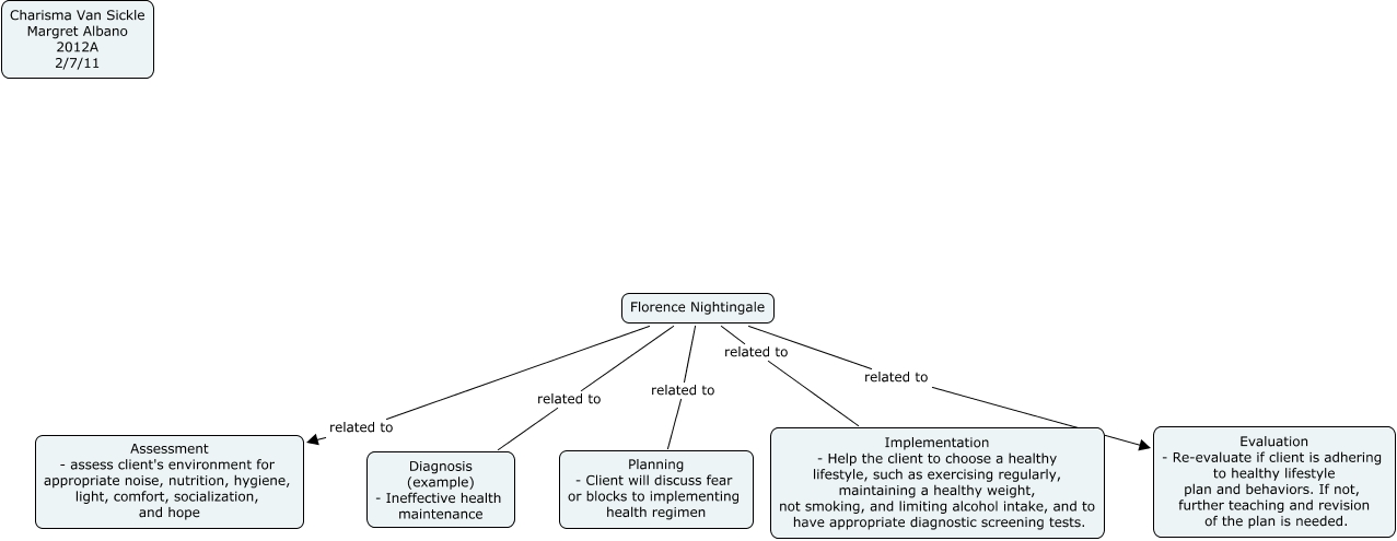 This Concept Map, created with IHMC CmapTools, has information related to: F.N. Theories, Florence Nightingale related to Diagnosis (example) - Ineffective health maintenance, Florence Nightingale related to Evaluation - Re-evaluate if client is adhering to healthy lifestyle plan and behaviors. If not, further teaching and revision of the plan is needed., Florence Nightingale related to Assessment - assess client's environment for appropriate noise, nutrition, hygiene, light, comfort, socialization, and hope, Florence Nightingale related to Planning - Client will discuss fear or blocks to implementing health regimen, Florence Nightingale related to Implementation - Help the client to choose a healthy lifestyle, such as exercising regularly, maintaining a healthy weight, not smoking, and limiting alcohol intake, and to have appropriate diagnostic screening tests.