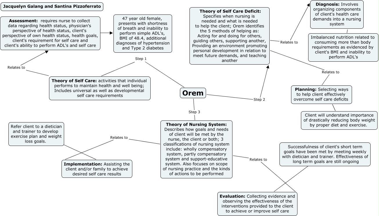 This Concept Map, created with IHMC CmapTools, has information related to: Theorist Extra Credit, Theory of Self Care Deficit: Specifies when nursing is needed and what is needed to help the client; Orem identifies the 5 methods of helping as: Acting for and doing for others, guiding others, supporting another, Providing an environment promoting personal development in relation to meet future demands, and teaching another Relates to Diagnosis: Involves organizing components of client's health care demands into a nursing system, Theory of Self Care Deficit: Specifies when nursing is needed and what is needed to help the client; Orem identifies the 5 methods of helping as: Acting for and doing for others, guiding others, supporting another, Providing an environment promoting personal development in relation to meet future demands, and teaching another Relates to Planning: Selecting ways to help client effectively overcome self care deficits, Theory of Self Care: activities that individual performs to maintain health and well being; Includes universal as well as developmental self care requirements Relates to Assessment: requires nurse to collect data regarding health status, physician's perspective of health status, client's perspective of own health status, health goals, client's requirement for self care and client's ability to perform ADL's and self care, Diagnosis: Involves organizing components of client's health care demands into a nursing system ???? Imbalanced nutrition related to consuming more than body requirements as evidenced by client's BMI and inability to perform ADL's, Orem Step 3 Theory of Nursing System: Describes how goals and needs of client will be met by the nurse, the client or both; 3 classifications of nursing system include: wholly compensatory system, partly compensatory system and support-educative system. Also focuses on scope of nursing practice and the kinds of actions to be performed, Orem Step 1 Theory of Self Care: activities that individual performs to maintain health and well being; Includes universal as well as developmental self care requirements, Refer client to a dietician and trainer to develop exercise plan and weight loss goals. ???? Implementation: Assisting the client and/or family to achieve desired self care results, Assessment: requires nurse to collect data regarding health status, physician's perspective of health status, client's perspective of own health status, health goals, client's requirement for self care and client's ability to perform ADL's and self care ???? 47 year old female, presents with shortness of breath and inability to perform simple ADL's, BMI of 48.4, additional diagnoses of hypertension and Type 2 diabetes, Orem Step 2 Theory of Self Care Deficit: Specifies when nursing is needed and what is needed to help the client; Orem identifies the 5 methods of helping as: Acting for and doing for others, guiding others, supporting another, Providing an environment promoting personal development in relation to meet future demands, and teaching another, Planning: Selecting ways to help client effectively overcome self care deficits ???? Client will understand importance of drastically reducing body weight by proper diet and exercise., Evaluation: Collecting evidence and observing the effectiveness of the interventions provided to the client to achieve or improve self care ???? Successfulness of client's short term goals have been met by meeting weekly with dietician and trainer. Effectiveness of long term goals are still ongoing, Theory of Nursing System: Describes how goals and needs of client will be met by the nurse, the client or both; 3 classifications of nursing system include: wholly compensatory system, partly compensatory system and support-educative system. Also focuses on scope of nursing practice and the kinds of actions to be performed Relates to Evaluation: Collecting evidence and observing the effectiveness of the interventions provided to the client to achieve or improve self care, Theory of Nursing System: Describes how goals and needs of client will be met by the nurse, the client or both; 3 classifications of nursing system include: wholly compensatory system, partly compensatory system and support-educative system. Also focuses on scope of nursing practice and the kinds of actions to be performed Relates to Implementation: Assisting the client and/or family to achieve desired self care results