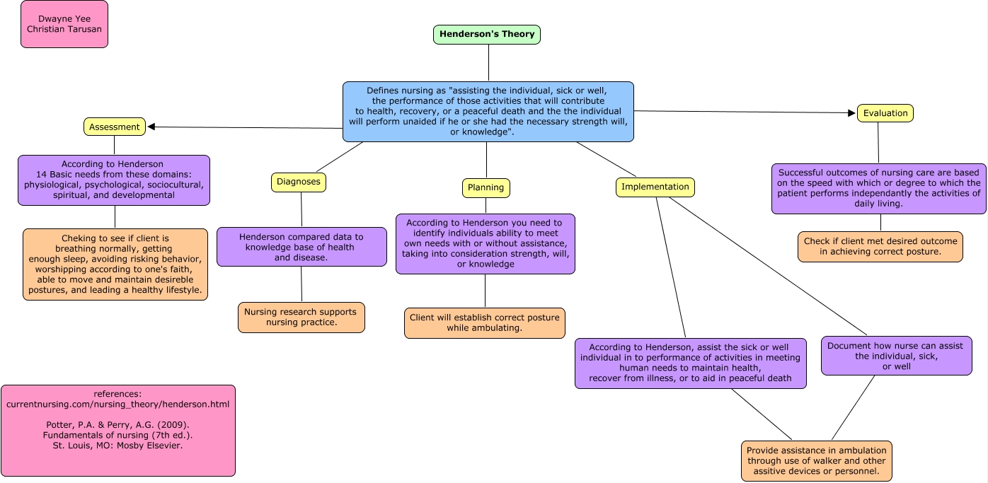 This Concept Map, created with IHMC CmapTools, has information related to: Henderson Theorist Concept Map, According to Henderson, assist the sick or well individual in to performance of activities in meeting human needs to maintain health, recover from illness, or to aid in peaceful death ???? Provide assistance in ambulation through use of walker and other assitive devices or personnel., Defines nursing as "assisting the individual, sick or well, the performance of those activities that will contribute to health, recovery, or a peaceful death and the the individual will perform unaided if he or she had the necessary strength will, or knowledge". ???? Implementation, Diagnoses ???? Henderson compared data to knowledge base of health and disease., Evaluation ???? Successful outcomes of nursing care are based on the speed with which or degree to which the patient performs independantly the activities of daily living., Document how nurse can assist the individual, sick, or well ???? Provide assistance in ambulation through use of walker and other assitive devices or personnel., Defines nursing as "assisting the individual, sick or well, the performance of those activities that will contribute to health, recovery, or a peaceful death and the the individual will perform unaided if he or she had the necessary strength will, or knowledge". ???? Evaluation, Implementation ???? According to Henderson, assist the sick or well individual in to performance of activities in meeting human needs to maintain health, recover from illness, or to aid in peaceful death, Henderson's Theory ???? Defines nursing as "assisting the individual, sick or well, the performance of those activities that will contribute to health, recovery, or a peaceful death and the the individual will perform unaided if he or she had the necessary strength will, or knowledge"., Planning ???? According to Henderson you need to identify individuals ability to meet own needs with or without assistance, taking into consideration strength, will, or knowledge, According to Henderson you need to identify individuals ability to meet own needs with or without assistance, taking into consideration strength, will, or knowledge ???? Client will establish correct posture while ambulating., Defines nursing as "assisting the individual, sick or well, the performance of those activities that will contribute to health, recovery, or a peaceful death and the the individual will perform unaided if he or she had the necessary strength will, or knowledge". ???? Planning, Defines nursing as "assisting the individual, sick or well, the performance of those activities that will contribute to health, recovery, or a peaceful death and the the individual will perform unaided if he or she had the necessary strength will, or knowledge". ???? Assessment, Implementation ???? Document how nurse can assist the individual, sick, or well, Successful outcomes of nursing care are based on the speed with which or degree to which the patient performs independantly the activities of daily living. ???? Check if client met desired outcome in achieving correct posture., Henderson compared data to knowledge base of health and disease. ???? Nursing research supports nursing practice., Assessment ???? According to Henderson 14 Basic needs from these domains: physiological, psychological, sociocultural, spiritual, and developmental, According to Henderson 14 Basic needs from these domains: physiological, psychological, sociocultural, spiritual, and developmental ???? Cheking to see if client is breathing normally, getting enough sleep, avoiding risking behavior, worshipping according to one's faith, able to move and maintain desireble postures, and leading a healthy lifestyle., Defines nursing as "assisting the individual, sick or well, the performance of those activities that will contribute to health, recovery, or a peaceful death and the the individual will perform unaided if he or she had the necessary strength will, or knowledge". ???? Diagnoses