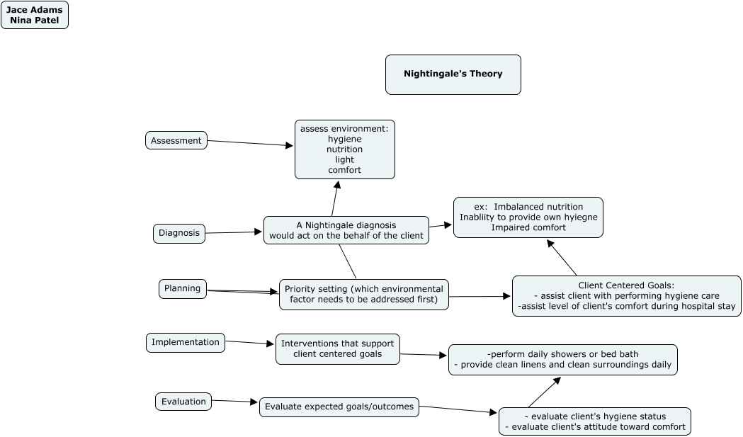 This Concept Map, created with IHMC CmapTools, has information related to: Nightingale_Jace, Planning ???? Client Centered Goals: - assist client with performing hygiene care -assist level of client's comfort during hospital stay, Evaluation ???? Evaluate expected goals/outcomes, Planning ???? Priority setting (which environmental factor needs to be addressed first), Assessment ???? assess environment: hygiene nutrition light comfort, - evaluate client's hygiene status - evaluate client's attitude toward comfort ???? -perform daily showers or bed bath - provide clean linens and clean surroundings daily, A Nightingale diagnosis would act on the behalf of the client ???? ex: Imbalanced nutrition Inabliity to provide own hyiegne Impaired comfort, Evaluate expected goals/outcomes ???? - evaluate client's hygiene status - evaluate client's attitude toward comfort, Implementation ???? Interventions that support client centered goals, Diagnosis ???? A Nightingale diagnosis would act on the behalf of the client, Client Centered Goals: - assist client with performing hygiene care -assist level of client's comfort during hospital stay ???? ex: Imbalanced nutrition Inabliity to provide own hyiegne Impaired comfort, Priority setting (which environmental factor needs to be addressed first) ???? assess environment: hygiene nutrition light comfort, Interventions that support client centered goals ???? -perform daily showers or bed bath - provide clean linens and clean surroundings daily