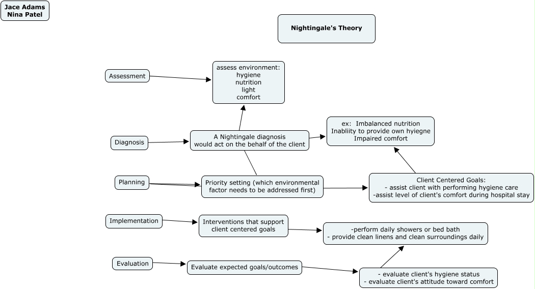 This Concept Map, created with IHMC CmapTools, has information related to: Nightingale_Nina, Planning ???? Client Centered Goals: - assist client with performing hygiene care -assist level of client's comfort during hospital stay, Evaluation ???? Evaluate expected goals/outcomes, Assessment ???? assess environment: hygiene nutrition light comfort, Planning ???? Priority setting (which environmental factor needs to be addressed first), - evaluate client's hygiene status - evaluate client's attitude toward comfort ???? -perform daily showers or bed bath - provide clean linens and clean surroundings daily, A Nightingale diagnosis would act on the behalf of the client ???? ex: Imbalanced nutrition Inabliity to provide own hyiegne Impaired comfort, Diagnosis ???? A Nightingale diagnosis would act on the behalf of the client, Implementation ???? Interventions that support client centered goals, Evaluate expected goals/outcomes ???? - evaluate client's hygiene status - evaluate client's attitude toward comfort, Client Centered Goals: - assist client with performing hygiene care -assist level of client's comfort during hospital stay ???? ex: Imbalanced nutrition Inabliity to provide own hyiegne Impaired comfort, Interventions that support client centered goals ???? -perform daily showers or bed bath - provide clean linens and clean surroundings daily, Priority setting (which environmental factor needs to be addressed first) ???? assess environment: hygiene nutrition light comfort