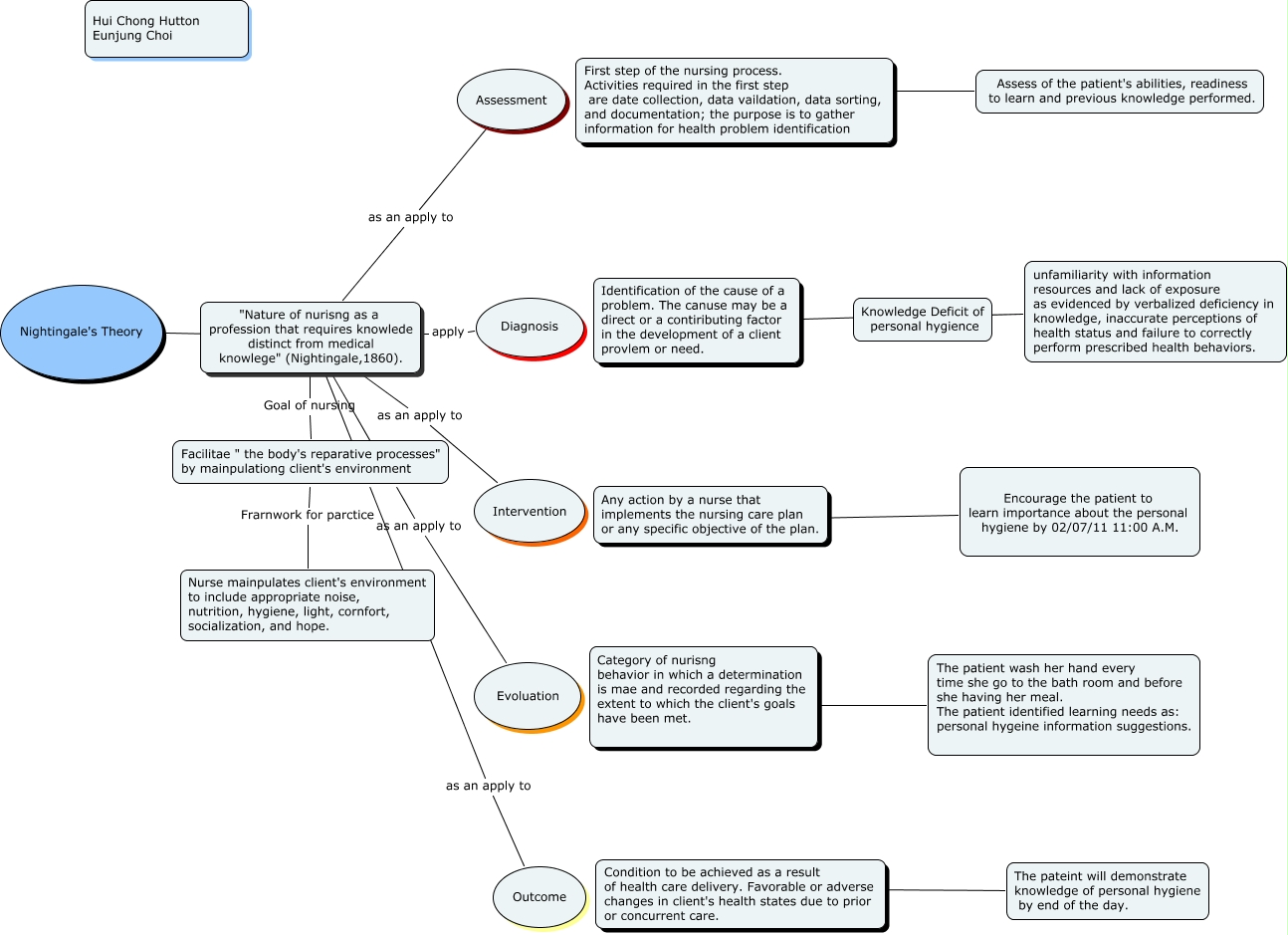 This Concept Map, created with IHMC CmapTools, has information related to: Huichong&Eunjung, "Nature of nurisng as a profession that requires knowlede distinct from medical knowlege" (Nightingale,1860). as an apply to Assessment, Nightingale's Theory ???? "Nature of nurisng as a profession that requires knowlede distinct from medical knowlege" (Nightingale,1860)., Condition to be achieved as a result of health care delivery. Favorable or adverse changes in client's health states due to prior or concurrent care. ???? The pateint will demonstrate knowledge of personal hygiene by end of the day., Identification of the cause of a problem. The canuse may be a direct or a contiributing factor in the development of a client provlem or need. ???? unfamiliarity with information resources and lack of exposure as evidenced by verbalized deficiency in knowledge, inaccurate perceptions of health status and failure to correctly perform prescribed health behaviors., "Nature of nurisng as a profession that requires knowlede distinct from medical knowlege" (Nightingale,1860). as an apply to Evoluation, "Nature of nurisng as a profession that requires knowlede distinct from medical knowlege" (Nightingale,1860). Goal of nursing Facilitae " the body's reparative processes" by mainpulationg client's environment, "Nature of nurisng as a profession that requires knowlede distinct from medical knowlege" (Nightingale,1860). as an apply to Outcome, Facilitae " the body's reparative processes" by mainpulationg client's environment Frarnwork for parctice Nurse mainpulates client's environment to include appropriate noise, nutrition, hygiene, light, cornfort, socialization, and hope., First step of the nursing process. Activities required in the first step are date collection, data vaildation, data sorting, and documentation; the purpose is to gather information for health problem identification ???? Assess of the patient's abilities, readiness to learn and previous knowledge performed., Category of nurisng behavior in which a determination is mae and recorded regarding the extent to which the client's goals have been met. ???? The patient wash her hand every time she go to the bath room and before she having her meal. The patient identified learning needs as: personal hygeine information suggestions., Any action by a nurse that implements the nursing care plan or any specific objective of the plan. ???? Encourage the patient to learn importance about the personal hygiene by 02/07/11 11:00 A.M., "Nature of nurisng as a profession that requires knowlede distinct from medical knowlege" (Nightingale,1860). as an apply to Intervention, "Nature of nurisng as a profession that requires knowlede distinct from medical knowlege" (Nightingale,1860). apply Diagnosis