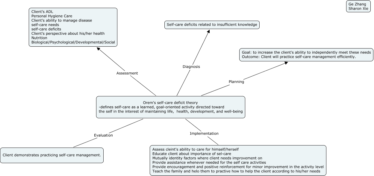 This Concept Map, created with IHMC CmapTools, has information related to: Orem's self-care deficit theory, Orem's self-care deficit theory -defines self-care as a learned, goal-oriented activity directed toward the self in the interest of maintaining life, health, development, and well-being Planning Goal: to increase the client's ability to independently meet these needs Outcome: Client will practice self-care management efficiently., Orem's self-care deficit theory -defines self-care as a learned, goal-oriented activity directed toward the self in the interest of maintaining life, health, development, and well-being Assessment Client's ADL Personal Hygiene Care Client's ability to manage disease self-care needs self-care deficits Client's perspective about his/her health Nutrition Biological/Psychological/Developmental/Social, Orem's self-care deficit theory -defines self-care as a learned, goal-oriented activity directed toward the self in the interest of maintaining life, health, development, and well-being Implementation Assess cleint's ability to care for himself/herself Educate client about importance of sel-care Mutually identity factors where client needs improvement on Provide assistance whenever needed for the self care activities Provide encouragement and positive reinforcement for minor improvement in the activity level Teach the family and helo them to practive how to help the client according to his/her needs, Orem's self-care deficit theory -defines self-care as a learned, goal-oriented activity directed toward the self in the interest of maintaining life, health, development, and well-being Evaluation Client demonstrates practicing self-care management., Orem's self-care deficit theory -defines self-care as a learned, goal-oriented activity directed toward the self in the interest of maintaining life, health, development, and well-being Diagnosis Self-care deficits related to insufficient knowledge