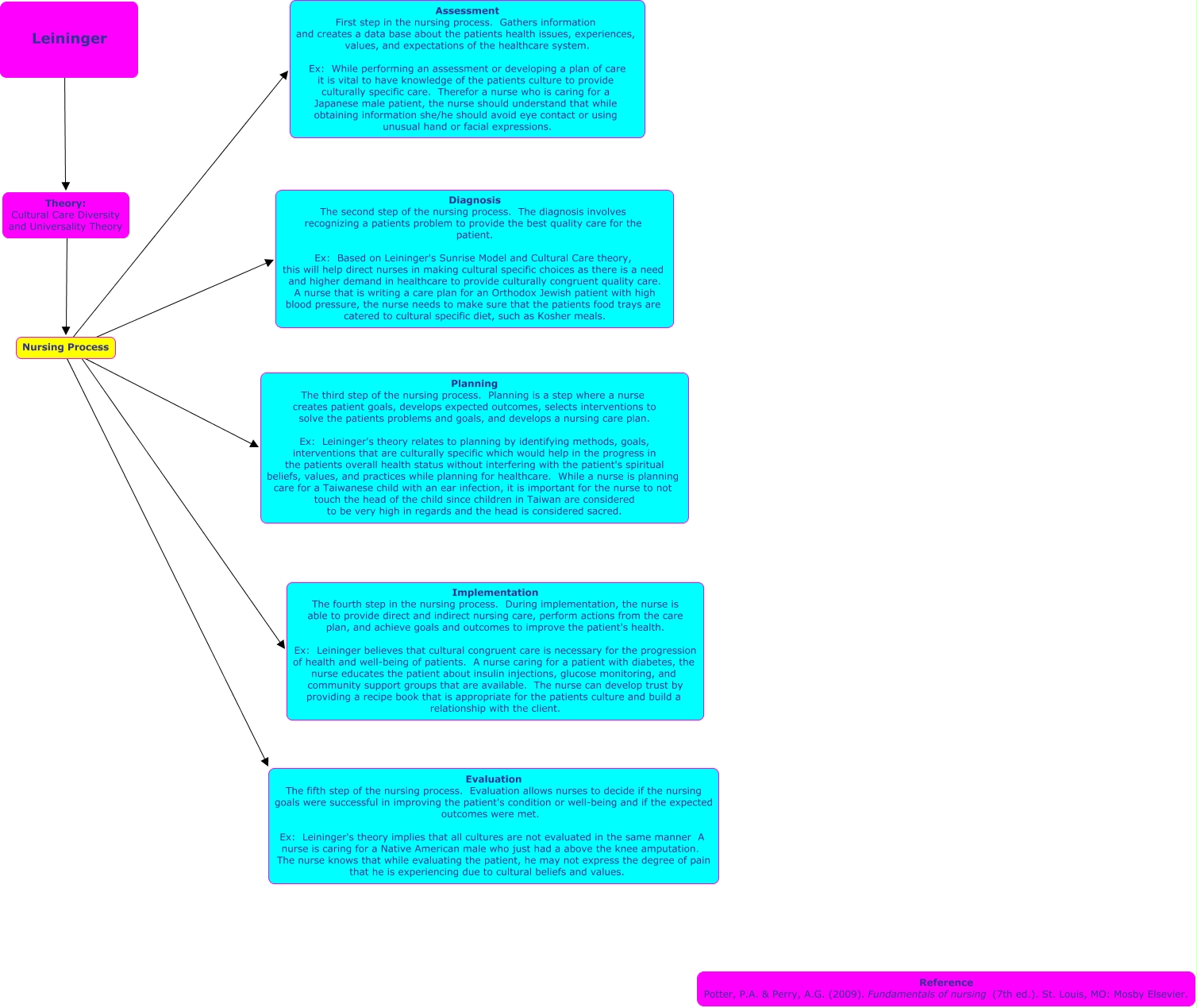 This Concept Map, created with IHMC CmapTools, has information related to: Extra Credit Theorist CMap - Lythgoe, Nursing Process ???? Planning The third step of the nursing process. Planning is a step where a nurse creates patient goals, develops expected outcomes, selects interventions to solve the patients problems and goals, and develops a nursing care plan. Ex: Leininger's theory relates to planning by identifying methods, goals, interventions that are culturally specific which would help in the progress in the patients overall health status without interfering with the patient's spiritual beliefs, values, and practices while planning for healthcare. While a nurse is planning care for a Taiwanese child with an ear infection, it is important for the nurse to not touch the head of the child since children in Taiwan are considered to be very high in regards and the head is considered sacred., Nursing Process ???? Implementation The fourth step in the nursing process. During implementation, the nurse is able to provide direct and indirect nursing care, perform actions from the care plan, and achieve goals and outcomes to improve the patient's health. Ex: Leininger believes that cultural congruent care is necessary for the progression of health and well-being of patients. A nurse caring for a patient with diabetes, the nurse educates the patient about insulin injections, glucose monitoring, and community support groups that are available. The nurse can develop trust by providing a recipe book that is appropriate for the patients culture and build a relationship with the client., Nursing Process ???? Assessment First step in the nursing process. Gathers information and creates a data base about the patients health issues, experiences, values, and expectations of the healthcare system. Ex: While performing an assessment or developing a plan of care it is vital to have knowledge of the patients culture to provide culturally specific care. Therefor a nurse who is caring for a Japanese male patient, the nurse should understand that while obtaining information she/he should avoid eye contact or using unusual hand or facial expressions., Leininger ???? Theory: Cultural Care Diversity and Universality Theory, Theory: Cultural Care Diversity and Universality Theory ???? Nursing Process, Nursing Process ???? Evaluation The fifth step of the nursing process. Evaluation allows nurses to decide if the nursing goals were successful in improving the patient's condition or well-being and if the expected outcomes were met. Ex: Leininger's theory implies that all cultures are not evaluated in the same manner A nurse is caring for a Native American male who just had a above the knee amputation. The nurse knows that while evaluating the patient, he may not express the degree of pain that he is experiencing due to cultural beliefs and values., Nursing Process ???? Diagnosis The second step of the nursing process. The diagnosis involves recognizing a patients problem to provide the best quality care for the patient. Ex: Based on Leininger's Sunrise Model and Cultural Care theory, this will help direct nurses in making cultural specific choices as there is a need and higher demand in healthcare to provide culturally congruent quality care. A nurse that is writing a care plan for an Orthodox Jewish patient with high blood pressure, the nurse needs to make sure that the patients food trays are catered to cultural specific diet, such as Kosher meals.