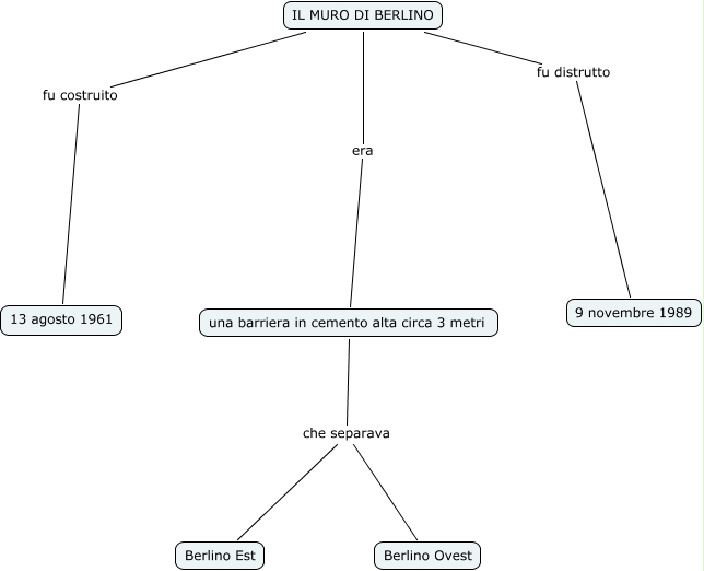 Questa Cmap, creata con IHMC CmapTools, contiene informazioni relative a: IL MURO DI BERLINO, IL MURO DI BERLINO fu costruito 13 agosto 1961, una barriera in cemento alta circa 3 metri che separava Berlino Ovest, IL MURO DI BERLINO era una barriera in cemento alta circa 3 metri, una barriera in cemento alta circa 3 metri che separava Berlino Est, IL MURO DI BERLINO fu distrutto 9 novembre 1989