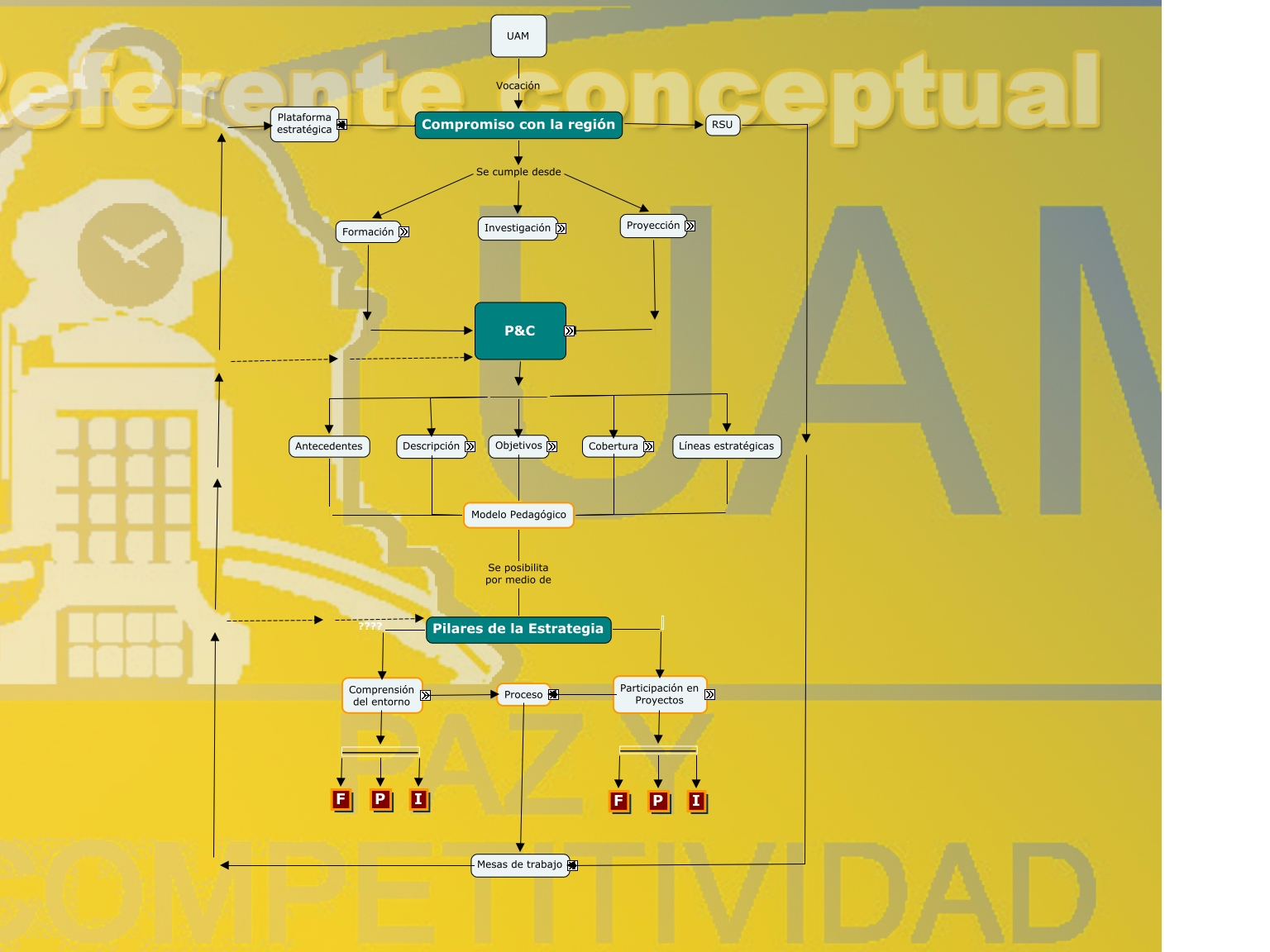 Este Cmap, tiene información relacionada con: Referente conceptual, Descripción Síntesis del Programa Modelo Pedagógico, Cobertura Ubicación Modelo Pedagógico, Compromiso con la región Se cumple desde Investigación, UAM Vocación Compromiso con la región, Participación en Proyectos ______ F, Objetivos Estratégicos formación Modelo Pedagógico, RSU o Mesas de trabajo, P&C _________ Antecedentes, P&C _________ Descripción, Compromiso con la región o Plataforma estratégica, P&C _________ Líneas estratégicas, Antecedentes Modelo Pedagógico, Pilares de la Estrategia Participación en Proyectos, P&C 2 Temática y problemática, Comprensión del entorno 1 Concepción metodológica, Participación en Proyectos Proceso Mesas de trabajo, Participación en Proyectos ______ P, Formación P&C, Modelo Pedagógico Se posibilita por medio de Pilares de la Estrategia, Compromiso con la región o RSU