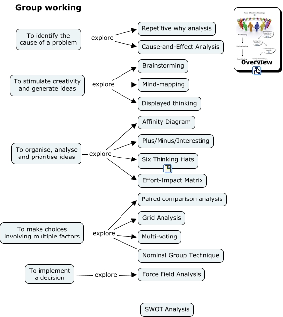 This Concept Map, created with IHMC CmapTools, has information related to: Meeting (groupwork), To organise, analyse and prioritise ideas explore Six Thinking Hats, To stimulate creativity and generate ideas explore Displayed thinking, To organise, analyse and prioritise ideas explore Affinity Diagram, To stimulate creativity and generate ideas explore Mind-mapping, To make choices involving multiple factors explore Grid Analysis, To stimulate creativity and generate ideas explore Brainstorming, To make choices involving multiple factors explore Paired comparison analysis, To organise, analyse and prioritise ideas explore Plus/Minus/Interesting, To implement a decision explore Force Field Analysis, To make choices involving multiple factors explore Nominal Group Technique, To organise, analyse and prioritise ideas explore Effort-Impact Matrix, To identify the cause of a problem explore Repetitive why analysis, To make choices involving multiple factors explore Multi-voting, To identify the cause of a problem explore Cause-and-Effect Analysis