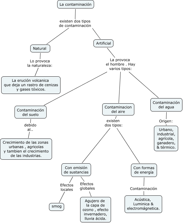Este Cmap, tiene información relacionada con: La contaminación, Contaminacion del aire existen dos tipos: Con emisión de sustancias, Artificial existen dos tipos de contaminación Natural, Con emisión de sustancias Efectos locales smog, La contaminación existen dos tipos de contaminación Natural, Natural Lo provoca la naturaleza: La erución volcanica que deja un rastro de cenizas y gases tóxicos., Con formas de energía Contaminación Acústica, Luminica & electromágnetica., Artificial La provoca el hombre . Hay varios tipos: Contaminacion del aire, Con emisión de sustancias Efectos globales Agujero de la capa de ozono , efecto invernadero, lluvia ácida., Contaminacion del aire existen dos tipos: Con formas de energía, Contaminación del suelo debido al.. Crecimiento de las zonas urbanas , agricolas y tambien el crecimiento de las industrias., Artificial La provoca el hombre . Hay varios tipos: Contaminación del agua, Artificial La provoca el hombre . Hay varios tipos: Contaminación del suelo, Contaminación del agua Origen: Urbano, industrial, agrícola, ganadero, & térmico.