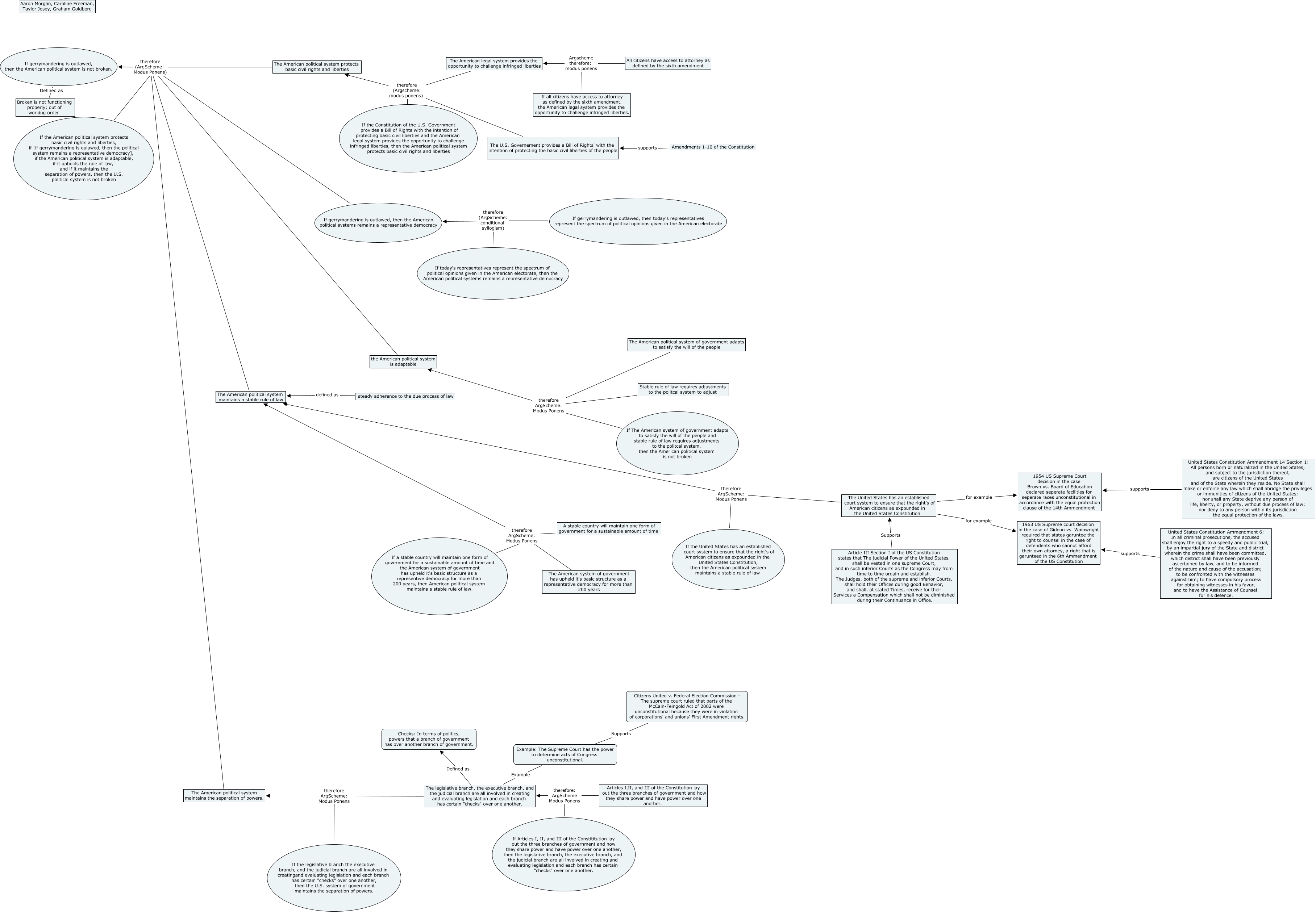 This Concept Map, created with IHMC CmapTools, has information related to: Group Project 1 - Political system not broken, If Articles I, II, and III of the Constititution lay out the three branches of government and how they share power and have power over one another, then the legislative branch, the executive branch, and the judicial branch are all involved in creating and evaluating legislation and each branch has certain "checks" over one another. therefore: ArgScheme Modus Ponens The legislative branch, the executive branch, and the judicial branch are all involved in creating and evaluating legislation and each branch has certain "checks" over one another., The U.S. Governement provides a Bill of Rights' with the intention of protecting the basic civil liberties of the people therefore (Argscheme: modus ponens) If the Constitution of the U.S. Government provides a Bill of Rights with the intention of protecting basic civil liberties and the American legal system provides the opportunity to challenge infringed liberties, then the American political system protects basic civil rights and liberties, The United States has an established court system to ensure that the right's of American citizens as expounded in the United States Constitution for example 1963 US Supreme court decision in the case of Gideon vs. Wainwright required that states garuntee the right to counsel in the case of defendents who cannot afford their own attorney, a right that is garunteed in the 6th Ammendment of the US Constitution, If The American system of government adapts to satisfy the will of the people and stable rule of law requires adjustments to the politcal system, then the American political system is not broken therefore ArgScheme: Modus Ponens the American political system is adaptable, The American legal system provides the opportunity to challenge infringed liberties therefore (Argscheme: modus ponens) If the Constitution of the U.S. Government provides a Bill of Rights with the intention of protecting basic civil liberties and the American legal system provides the opportunity to challenge infringed liberties, then the American political system protects basic civil rights and liberties, If gerrymandering is outlawed, then the American political system is not broken. Defined as Broken is not functioning properly; out of working order, All citizens have access to attorney as defined by the sixth amendment Argscheme therefore: modus ponens The American legal system provides the opportunity to challenge infringed liberties, If today's representatives represent the spectrum of political opinions given in the American electorate, then the American political systems remains a representative democracy therefore (ArgScheme: conditional syllogism) If gerrymandering is outlawed, then the American political systems remains a representative democracy, The American political system protects basic civil rights and liberties therefore (ArgScheme: Modus Ponens) If gerrymandering is outlawed, then the American political system is not broken., If the legislative branch the executive branch, and the judicial branch are all involved in creatingand evaluating legislation and each branch has certain "checks" over one another, then the U.S. system of government maintains the separation of powers. therefore ArgScheme: Modus Ponens The American political system maintains the separation of powers., Example: The Supreme Court has the power to determine acts of Congress unconstitutional. Example The legislative branch, the executive branch, and the judicial branch are all involved in creating and evaluating legislation and each branch has certain "checks" over one another., United States Constitution Ammendment 14 Section 1: All persons born or naturalized in the United States, and subject to the jurisdiction thereof, are citizens of the United States and of the State wherein they reside. No State shall make or enforce any law which shall abridge the privileges or immunities of citizens of the United States; nor shall any State deprive any person of life, liberty, or property, without due process of law; nor deny to any person within its jurisdiction the equal protection of the laws. supports 1954 US Supreme Court decision in the case Brown vs. Board of Education declared seperate facilities for seperate races unconstitutional in accordance with the equal protection clause of the 14th Ammendment, The American political system maintains a stable rule of law therefore (ArgScheme: Modus Ponens) If gerrymandering is outlawed, then the American political system is not broken., Article III Section I of the US Constitution states that The judicial Power of the United States, shall be vested in one supreme Court, and in such inferior Courts as the Congress may from time to time ordain and establish. The Judges, both of the supreme and inferior Courts, shall hold their Offices during good Behavior, and shall, at stated Times, receive for their Services a Compensation which shall not be diminished during their Continuance in Office. Supports The United States has an established court system to ensure that the right's of American citizens as expounded in the United States Constitution, Citizens United v. Federal Election Commission - The supreme court ruled that parts of the McCain-Feingold Act of 2002 were unconstitutional because they were in violation of corporations' and unions' First Amendment rights. Supports Example: The Supreme Court has the power to determine acts of Congress unconstitutional., The American political system maintains the separation of powers. therefore (ArgScheme: Modus Ponens) If gerrymandering is outlawed, then the American political system is not broken., the American political system is adaptable therefore (ArgScheme: Modus Ponens) If gerrymandering is outlawed, then the American political system is not broken., The American political system of government adapts to satisfy the will of the people therefore A