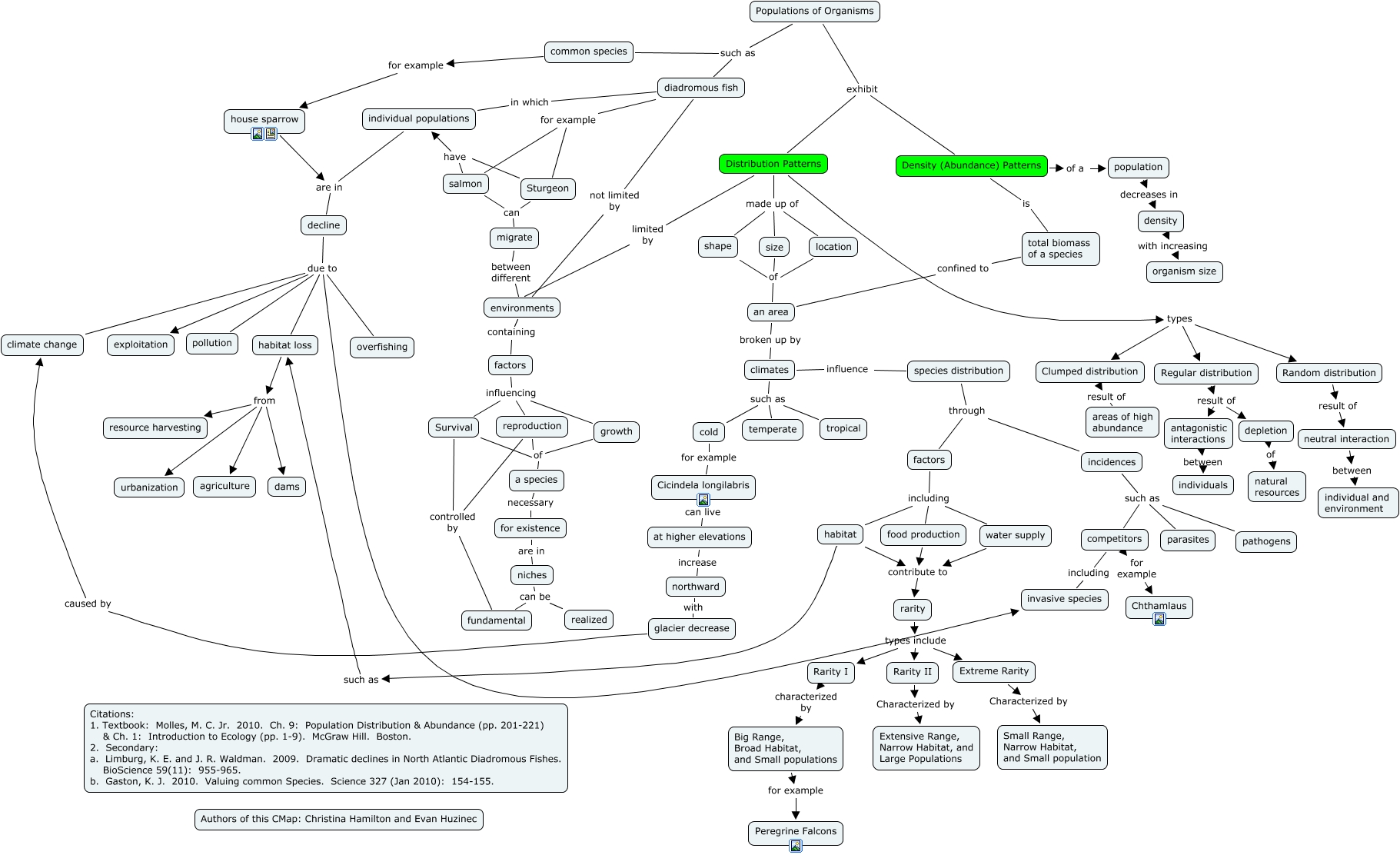 This Concept Map, created with IHMC CmapTools, has information related to: CH EH Pop D&A, decline due to overfishing, Distribution Patterns made up of shape, climates influence species distribution, Rarity I characterized by Big Range, Broad Habitat, and Small populations, factors including habitat, antagonistic interactions between individuals, Density (Abundance) Patterns is total biomass of a species, total biomass of a species confined to an area, rarity types include Rarity I, climates such as tropical, water supply contribute to rarity, Distribution Patterns types Regular distribution, diadromous fish in which individual populations, an area broken up by climates, incidences such as pathogens, Regular distribution result of depletion, Distribution Patterns made up of size, salmon have individual populations, diadromous fish for example Sturgeon, decline due to invasive species