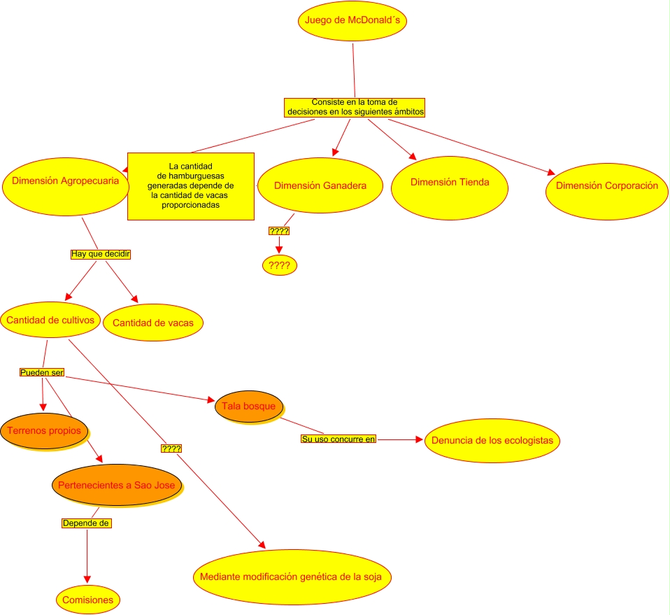Este Cmap, tiene información relacionada con: cmap bhart, Dimensión Agropecuaria La cantidad de hamburguesas generadas depende de la cantidad de vacas proporcionadas Dimensión Ganadera, Juego de McDonald´s Consiste en la toma de decisiones en los siguientes ámbitos Dimensión Tienda, Juego de McDonald´s Consiste en la toma de decisiones en los siguientes ámbitos Dimensión Ganadera, Pertenecientes a Sao Jose Depende de Comisiones, Cantidad de cultivos Pueden ser Pertenecientes a Sao Jose, Juego de McDonald´s Consiste en la toma de decisiones en los siguientes ámbitos Dimensión Agropecuaria, Cantidad de cultivos ???? Mediante modificación genética de la soja, Dimensión Agropecuaria Hay que decidir Cantidad de cultivos, Dimensión Ganadera ???? ????, Cantidad de cultivos Pueden ser Terrenos propios, Juego de McDonald´s Consiste en la toma de decisiones en los siguientes ámbitos Dimensión Corporación, Cantidad de cultivos Pueden ser Tala bosque, Dimensión Agropecuaria Hay que decidir Cantidad de vacas, Tala bosque Su uso concurre en Denuncia de los ecologistas