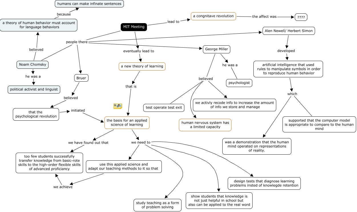 This Concept Map, created with IHMC CmapTools, has information related to: MIT Meeting, the basis for an applied science of learning we need to design tests that diagnose learning problems insted of knowlegde retention, MIT Meeting people there Alen Newell/ Herbert Simon, the basis for an applied science of learning we need to study teaching as a form of problem solving, George Miller believed test operate test exit, MIT Meeting eventually lead to a new theory of learning, that the psychological revolution initiated the basis for an applied science of learning, a new theory of learning that is the basis for an applied science of learning, George Miller he was a psychologist, the basis for an applied science of learning we need to show students that knowledge is not just helpful in school but also can be applied to the real word, artificial intelligence that used rules to manipulate symbols in order to reproduce human behavior which was a demonstration that the human mind operated on representations of reality., George Miller believed we activly recode info to increase the amount of info we store and manage, artificial intelligence that used rules to manipulate symbols in order to reproduce human behavior which supported that the computer model is appropriate to compare to the human mind, George Miller believed human nervous system has a limited capacity, Noam Chomsky he was a political activist and linguist, the basis for an applied science of learning we need to use this applied science and adapt our teaching methods to it so that, use this applied science and adapt our teaching methods to it so that we achieve too few students successfully transfer knowledge from basic-rote skills to the high-order flexible skills of advanced proficiancy, Noam Chomsky believed a theory of human behavior must account for language behaviors, MIT Meeting people there Noam Chomsky, a theory of human behavior must account for language behaviors because humans can make infinate sentences, Bruer believed that the psychological revolution