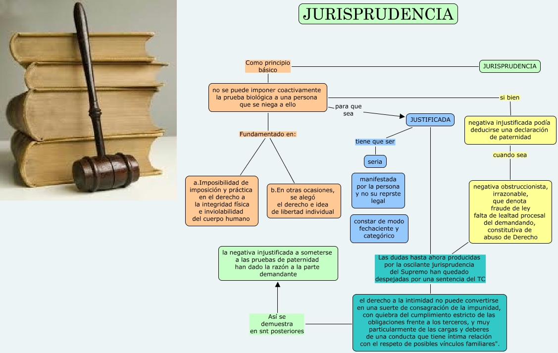 Este Cmap, tiene información relacionada con: Jurisprudencia, no se puede imponer coactivamente la prueba biológica a una persona que se niega a ello Fundamentado en: b.En otras ocasiones, se alegó el derecho e idea de libertad individual, JURISPRUDENCIA Como principio básico no se puede imponer coactivamente la prueba biológica a una persona que se niega a ello, negativa injustificada podía deducirse una declaración de paternidad cuando sea negativa obstruccionista, irrazonable, que denota fraude de ley falta de lealtad procesal del demandando, constitutiva de abuso de Derecho, JUSTIFICADA Las dudas hasta ahora producidas por la oscilante jurisprudencia del Supremo han quedado despejadas por una sentencia del TC el derecho a la intimidad no puede convertirse en una suerte de consagración de la impunidad, con quiebra del cumplimiento estricto de las obligaciones frente a los terceros, y muy particularmente de las cargas y deberes de una conducta que tiene íntima relación con el respeto de posibles vínculos familiares"., JUSTIFICADA tiene que ser seria, el derecho a la intimidad no puede convertirse en una suerte de consagración de la impunidad, con quiebra del cumplimiento estricto de las obligaciones frente a los terceros, y muy particularmente de las cargas y deberes de una conducta que tiene íntima relación con el respeto de posibles vínculos familiares". Así se demuestra en snt posteriores la negativa injustificada a someterse a las pruebas de paternidad han dado la razón a la parte demandante, no se puede imponer coactivamente la prueba biológica a una persona que se niega a ello Fundamentado en: a. Imposibilidad de imposición y práctica en el derecho a la integridad física e inviolabilidad del cuerpo humano, no se puede imponer coactivamente la prueba biológica a una persona que se niega a ello para que sea JUSTIFICADA, negativa obstruccionista, irrazonable, que denota fraude de ley falta de lealtad procesal del demandando, constitutiva de abuso de Derecho Las dudas hasta ahora producidas por la oscilante jurisprudencia del Supremo han quedado despejadas por una sentencia del TC el derecho a la intimidad no puede convertirse en una suerte de consagración de la impunidad, con quiebra del cumplimiento estricto de las obligaciones frente a los terceros, y muy particularmente de las cargas y deberes de una conducta que tiene íntima relación con el respeto de posibles vínculos familiares"., no se puede imponer coactivamente la prueba biológica a una persona que se niega a ello si bien negativa injustificada podía deducirse una declaración de paternidad