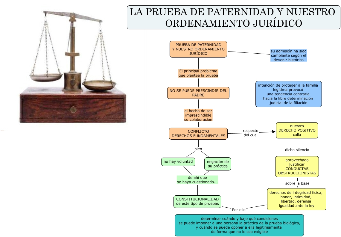 Este Cmap, tiene información relacionada con: PP en nuestro OJ, nuestro DERECHO POSITIVO calla dicho silencio aprovechado justificar CONDUCTAS OBSTRUCCIONISTAS, derechos de integridad física, honor, intimidad, libertad, defensa igualdad ante la ley Por ello determinar cuándo y bajo qué condiciones se puede imponer a una persona la práctica de la prueba biológica, y cuándo se puede oponer a ella legítimamente de forma que no le sea exigible, CONSTITUCIONALIDAD de este tipo de pruebas Por ello determinar cuándo y bajo qué condiciones se puede imponer a una persona la práctica de la prueba biológica, y cuándo se puede oponer a ella legítimamente de forma que no le sea exigible, CONFLICTO DERECHOS FUNDAMENTALES bien no hay voluntad, NO SE PUEDE PRESCINDIR DEL PADRE el hecho de ser imprescindible su colaboración CONFLICTO DERECHOS FUNDAMENTALES, negación de su práctica de ahí que se haya cuestionado... CONSTITUCIONALIDAD de este tipo de pruebas, PRUEBA DE PATERNIDAD Y NUESTRO ORDENAMIENTO JURÍDICO su admisión ha sido cambiante según el devenir histórico intención de proteger a la familia legítima provocó una tendencia contraria hacia la libre determinación judicial de la filiación, no hay voluntad de ahí que se haya cuestionado... CONSTITUCIONALIDAD de este tipo de pruebas, PRUEBA DE PATERNIDAD Y NUESTRO ORDENAMIENTO JURÍDICO El principal problema que plantea la prueba NO SE PUEDE PRESCINDIR DEL PADRE, CONFLICTO DERECHOS FUNDAMENTALES respecto del cual nuestro DERECHO POSITIVO calla, CONFLICTO DERECHOS FUNDAMENTALES bien negación de su práctica, aprovechado justificar CONDUCTAS OBSTRUCCIONISTAS sobre la base derechos de integridad física, honor, intimidad, libertad, defensa igualdad ante la ley