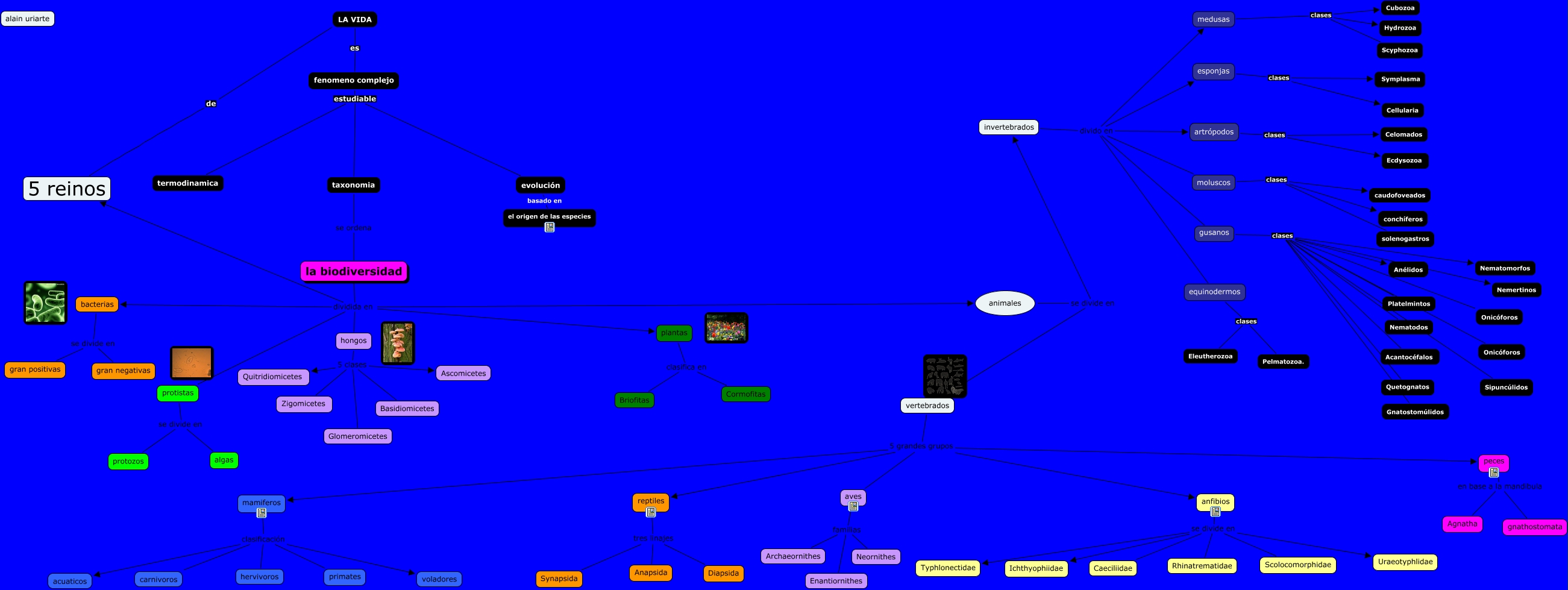 Este Cmap, tiene información relacionada con: alain uriarte linacero, bacterias se divide en gran negativas, artrópodos clases Ecdysozoa, reptiles tres linajes Diapsida, 5 reinos de LA VIDA, plantas clasifica en Cormofitas, vertebrados 5 grandes grupos peces, reptiles tres linajes Synapsida, hongos 5 clases Glomeromicetes, hongos 5 clases Zigomicetes, hongos 5 clases Basidiomicetes, moluscos clases solenogastros, anfibios se divide en Ichthyophiidae, artrópodos clases Celomados, anfibios se divide en Rhinatrematidae, esponjas clases Symplasma, hongos 5 clases Ascomicetes, gusanos clases Gnatostomúlidos, la biodiversidad dividida en animales, peces en base a la mandibula Agnatha, anfibios se divide en Typhlonectidae