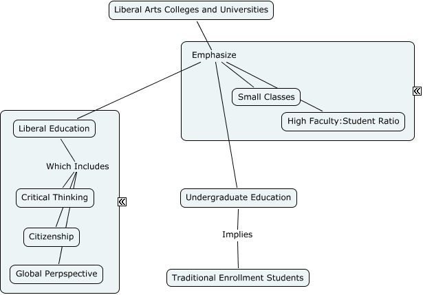 This Concept Map, created with IHMC CmapTools, has information related to: liberal arts, Liberal Arts Colleges and Universities Emphasize Small Classes, Liberal Education Which Includes Global Perpspective, Liberal Arts Colleges and Universities Emphasize High Faculty:Student Ratio, Liberal Arts Colleges and Universities Emphasize Undergraduate Education, Undergraduate Education Implies Traditional Enrollment Students, Liberal Education Which Includes Citizenship, Liberal Arts Colleges and Universities Emphasize Liberal Education, Liberal Education Which Includes Critical Thinking